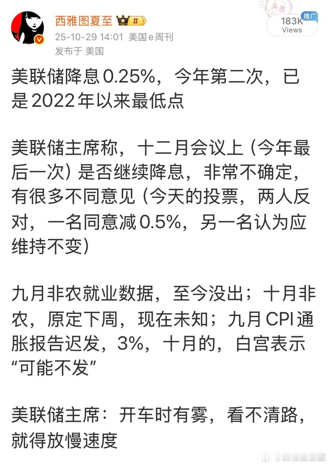 联邦政府宣布:不公布十月CPI通胀数据,因为“无法搜集数据”;十一月CPI,将在12月18日,美联储会议之后公布就业和通胀,美联储最重视的两项数据,下月开会时,都只有九月的,没有十月和十一月的鲍威尔自己的形容:大雾里开车,要减速慢行