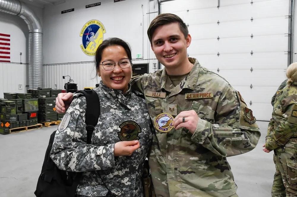 9月19日,美军阿拉斯加第168联队战斗武器教官约瑟夫·维拉中士与蒙古国家应急管理局空中搜救第111小组外事合作高级专家恩赫-阿里温中尉互换徽章,此前他们分享了最佳实践、技能以及关于武器射击训练的技术。
