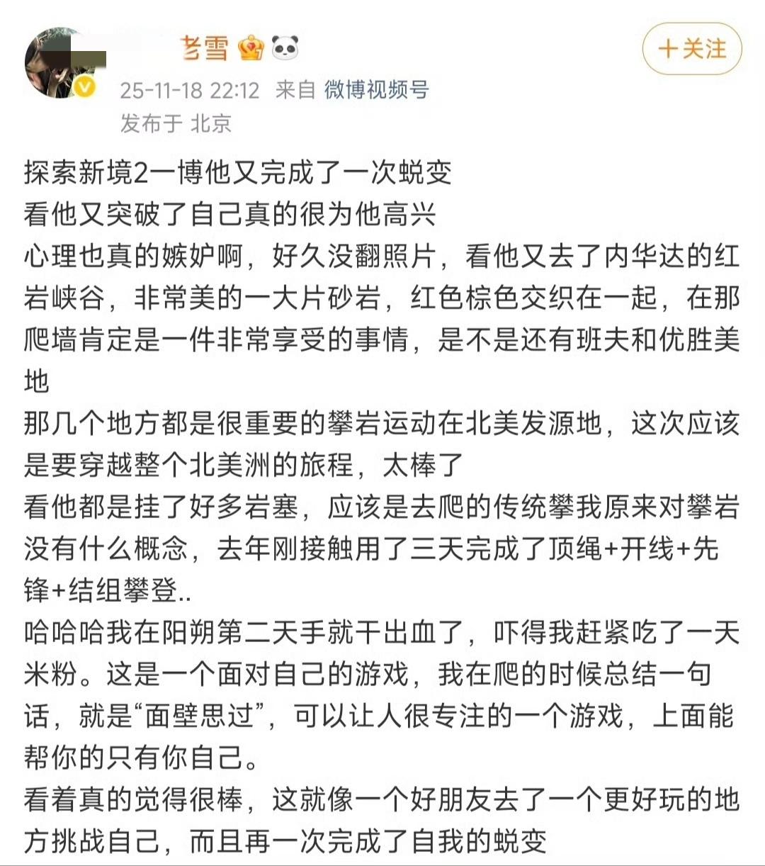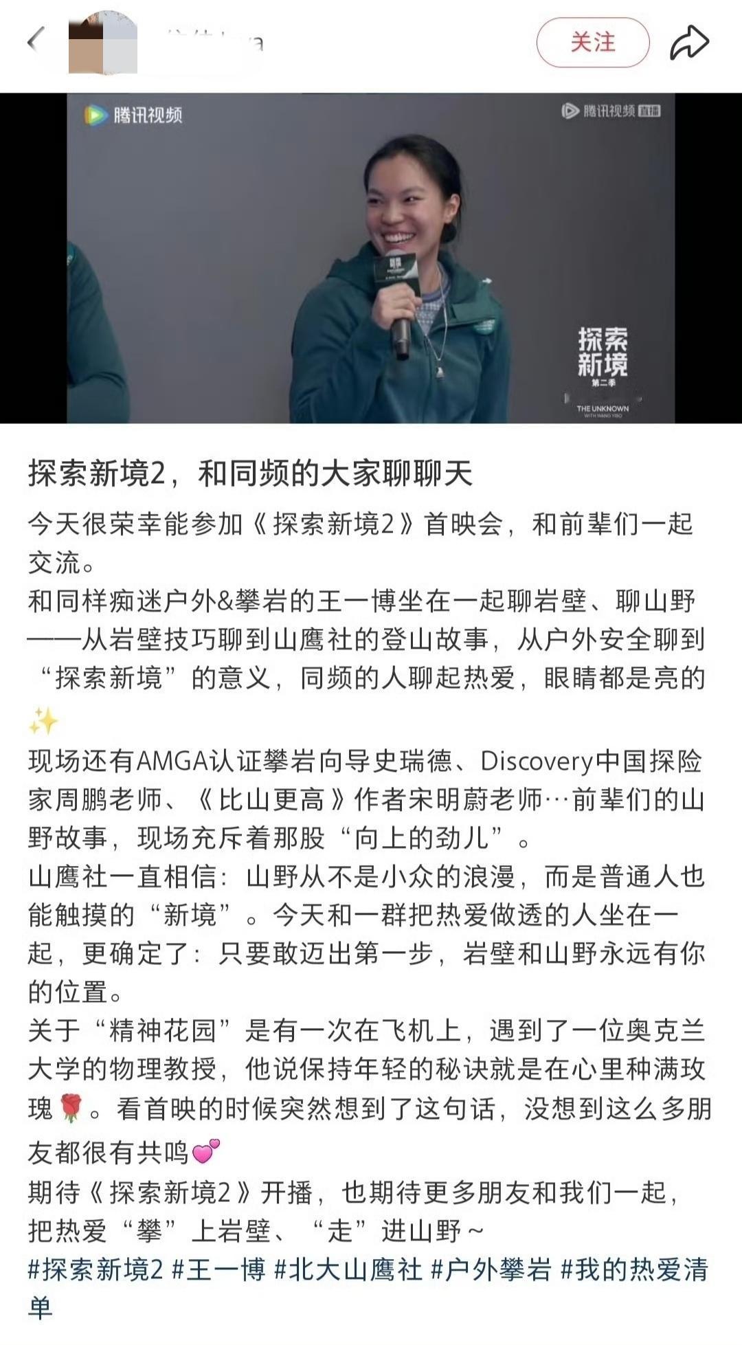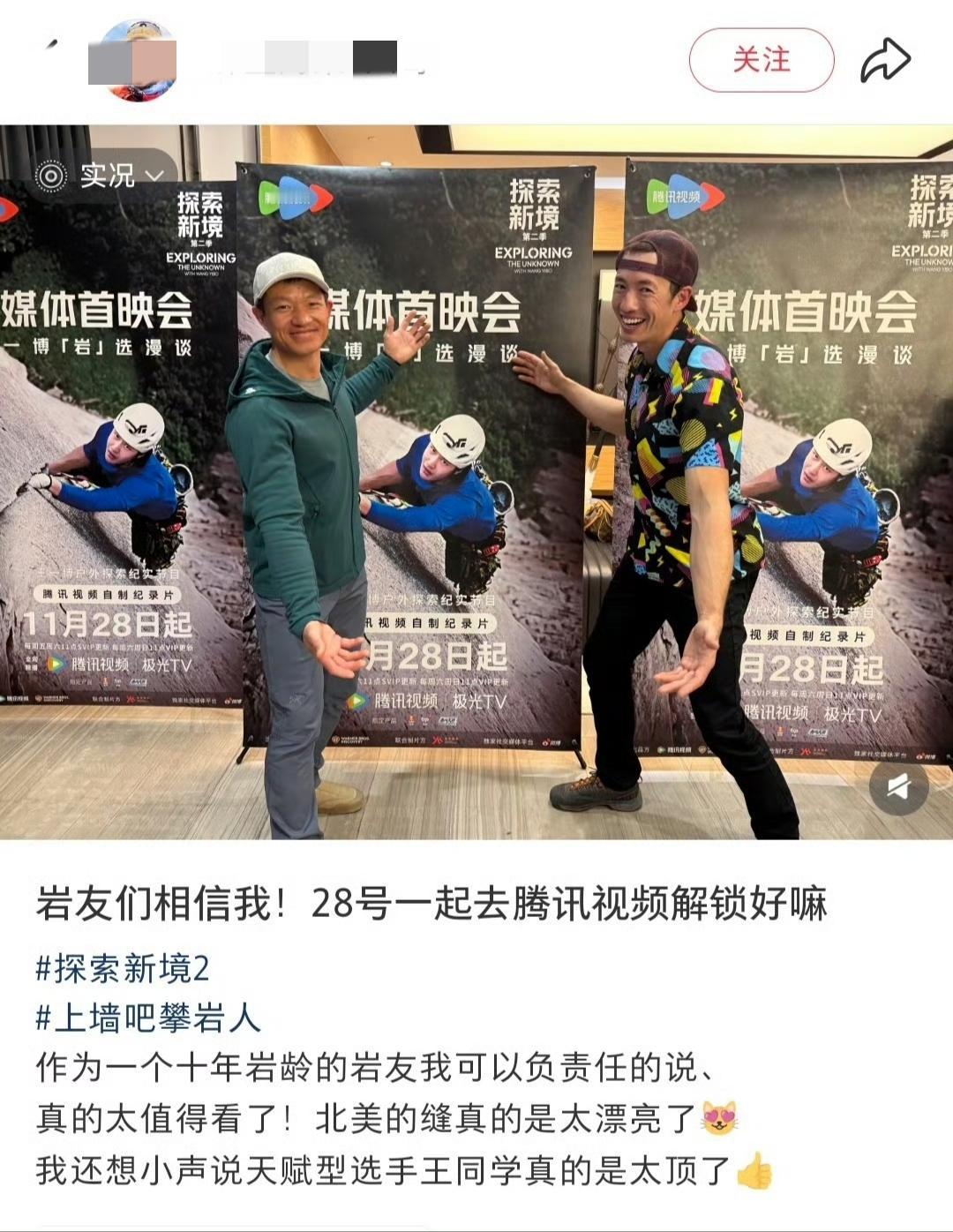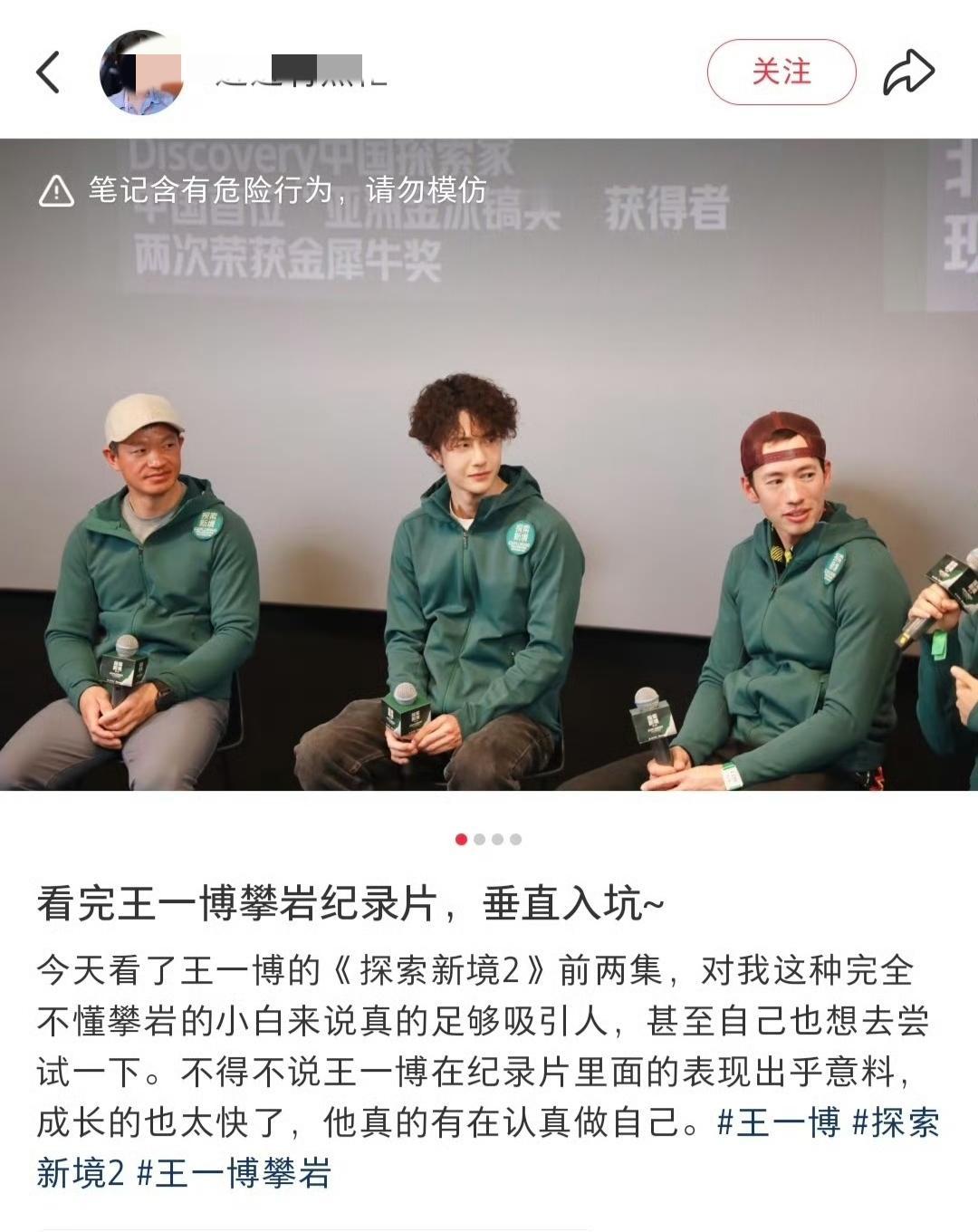 来自专业人士和现场路人观众的真实感受,真的更让人对王一博刮目相看,对《探索新境2》期待值拉满。“在探索新境第二季,看到了一个可以被称为climber的年轻人王一博” “探索新境2一博他又完成了一次蜕变” “天赋型选手王同学真的是太顶了” “和同频的人聊起热爱,眼睛都是亮的” 每一位现场嘉宾和专业人士无不透露出同样的对王一博的认可和赞誉,品行好天赋好且真诚真实,王一博就是有着让人折服的魅力。 每一次聊起热爱就眼睛亮晶晶的模样,是王一博啦。 王一博 王一博探索新境2定档1128