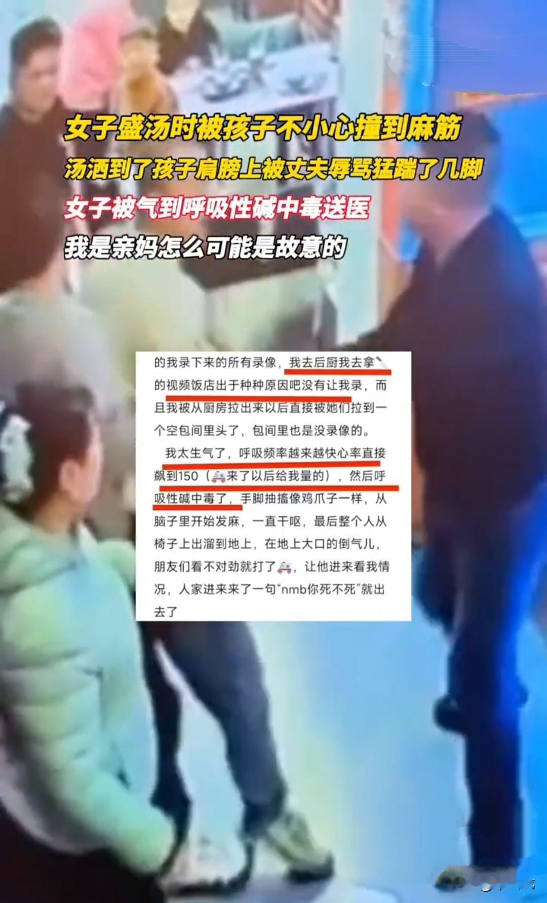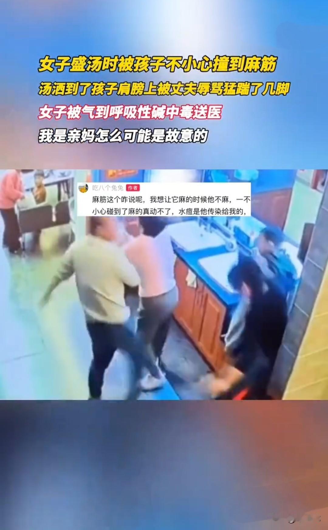 就因为妻子盛汤时被孩子撞到麻筋,不慎将汤泼到了孩子肩膀上,男子就不依不饶,一直在喋喋不休地指责妻子。妻子气不过,反驳了几句,男子暴跳如雷,当着外人的面就对妻子做出如此禽兽之事。 妻子起身盛汤时,被顽皮的儿子撞到了麻筋,不慎将热汤泼在孩子肩膀上。 妻子当即抱着孩子跑去卫生间接水清洗和物理降温,清洗过程中,男子也跟了过来,不是帮着清洗,而是站在一旁在高声责骂妻子,态度非常凶狠。 毕竟是自己的亲生孩子,妻子怎么可能是故意的,但丈夫一直在无理指责和谩骂,妻子实在听不了就反驳了几句,没想到捅了马蜂窝。 看到平时一向软弱可欺的妻子,竟然敢当众反驳自己,深感大失面子的丈夫恼羞成怒,抬脚就向妻子狠狠地踹去,一连踹了两脚,将妻子踹了坐在拖把池上。但男子还不依不饶,不顾好友的阻挡,又向坐在拖把池上的妻子狠狠踹了一脚,并扇了妻子一巴掌。 朋友们连忙赶了过来,七手八脚将男子拉开,男子余怒未消,边走还边回头继续责骂。 妻子全程没有还手,也没有说话,就这么呆呆地望着丈夫,这一刻,她已是万念俱灰,仿佛灵魂被撕裂一般,身体上的疼痛有极限,心灵上的疼痛却深不可测。 家暴只有零次和无数次,他竟然可以当着外人的面如此残忍地对待你,可以想象在家里,妻子是受了多大的委屈啊。 会家暴的男人是最无能的,当着朋友和自己孩子的面家暴妻子,更是禽兽不如,会给孩子幼小的心灵带来多大的伤害,让他留下一辈子难以磨灭的阴影,这样的男子不配有妻子,也不配有家庭和孩子,赶快离婚吧,一刻都不要等。 不光离婚,还应向法院提出民事和刑事诉讼,家庭暴力达到法律规定的严重程度时,施暴者将构成犯罪。 视频中男子的行为已经构成妥妥的犯罪了,这段视频就是最好的证据。 网络视频,如果存在侵权,请联系删除。