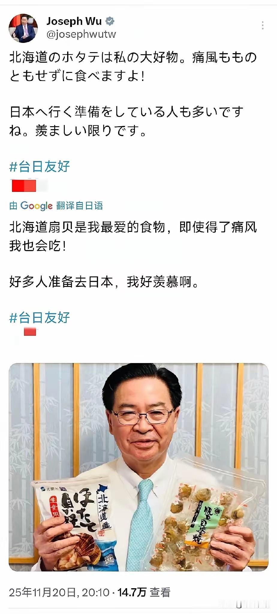 民进党某些人还真是媚日,你看这个吴桑(吴钊燮),真是媚日无底线。他近期在社媒平台发文称,北海道扇贝是我最爱的食物,即使得了痛风我也会吃! 是他真爱吃吗?还是别有用心,稍微琢磨下就知道。在目前大陆停止进口日本海产品后,他此举是为了表达自己的亲日立场,来为日本站台。同时由于他已被大陆定义为“顽固台独分子”,也借此机会同大陆唱反调。 不过,想把受核污染的日本海产品引进台湾,台湾人民会买账吗?另外,补充一句,如果这个吴桑真的爱吃,那就不妨多吃一些!