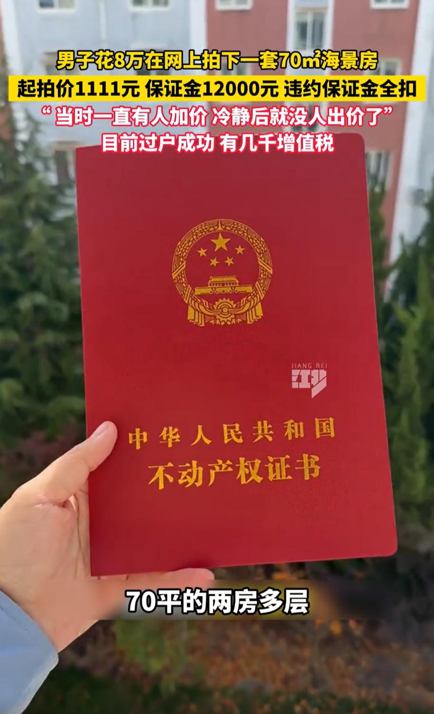 河南,一对夫妻在网上看到有海景房拍卖,一番竞拍后花8万元拍下了一套70平的海景房,本以为是捡了大便宜,可后面越想越不对劲,复盘了一下整个过程,突然觉得这钱可能花多了! 妻子介绍,最初是老公无意间看到网上有乳山的海景房拍卖,起拍价是1111,参与竞拍需要先交12000元的保证金,当时老公脑子一热,点了一下确认键,直接就扫码支付成功了 一开始每次竞拍加价是100块钱,但中间有一个自动增加5万元,还有几个人一起和老公参与竞拍,一下这个氛围就上来了,当时老公脑子一热,胜负欲一下就上来了,一直跟对方拍到7万多 眼看拍卖价格越来越高,老公这才冷静过来,准备放弃了,没想到之前跟他一起竞拍的几个人也都停手了,最终他们以8万元的价格拍下了这套房子,其中还有5000元税费需要他们自己承担 事后夫妻俩一合计,才发现这事有点蹊跷。要是竞拍成功不买,那12000元的保证金就打了水漂,算是违约。可要是买了,这价格真的合适吗? 妻子把这段经历发到网上后,有位刚从乳山回来的网友留言说,感觉这个价格还是贵了。据他了解,位置偏一点的小区,这种房子五万块就能买到。要是肯出到八万,完全可以在靠近大拇指广场或者大学城附近的小区,买到更好的房子 这事听起来像是捡漏,实际上却反映了不少人在面对看似便宜的拍卖时容易冲动。乳山海景房价格本来就不高,网上信息又杂,如果不是很了解当地行情,很容易在竞拍氛围中失去判断 其实不管是买房还是参与其他竞拍,事先做好功课很重要。不能光看起拍价低就冲动参与,还得了解清楚市场价、位置、配套以及后续费用。有时候,看似捡了便宜,实际上可能并不划算 这件事也提醒我们,网上参与竞拍一定要保持冷静。特别是在有保证金制度的情况下,更容易让人产生不拍下就亏了的心理。不过既然买了,还是要学会享受