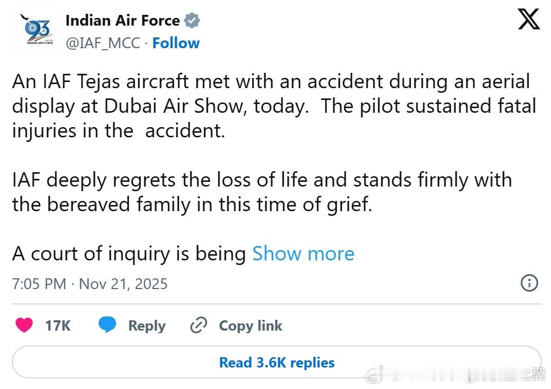 印度空军确认光辉战斗机飞行员在坠机中遇难