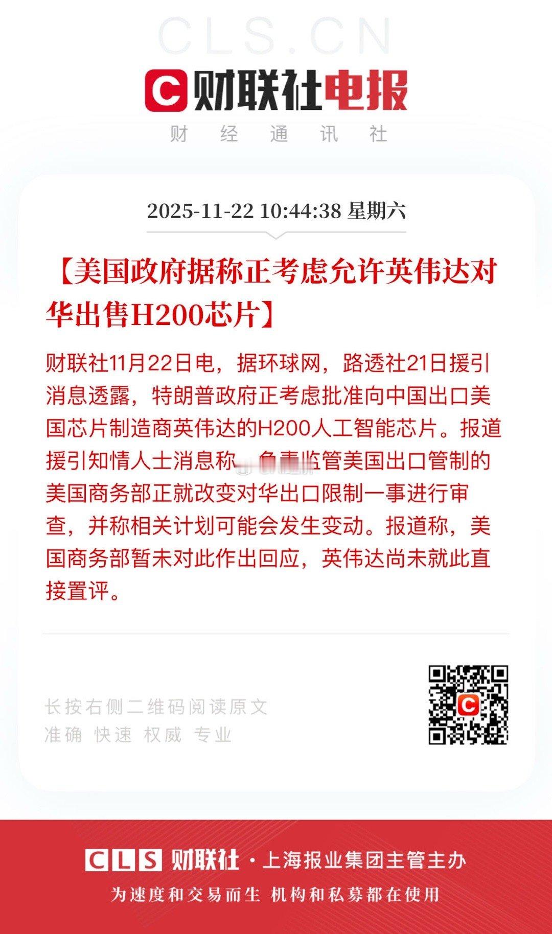 【美国政府据称正考虑允许英伟达对华出售H200芯片】财联社11月22日电,据环球网,路透社21日援引消息透露,特朗普政府正考虑批准向中国出口美国芯片制造商英伟达的H200人工智能芯片。报道援引知情人士消息称,负责监管美国出口管制的美国商务部正就改变对华出口限制一事进行审查,并称相关计划可能会发生变动。报道称,美国商务部暂未对此作出回应,英伟达尚未就此直接置评。