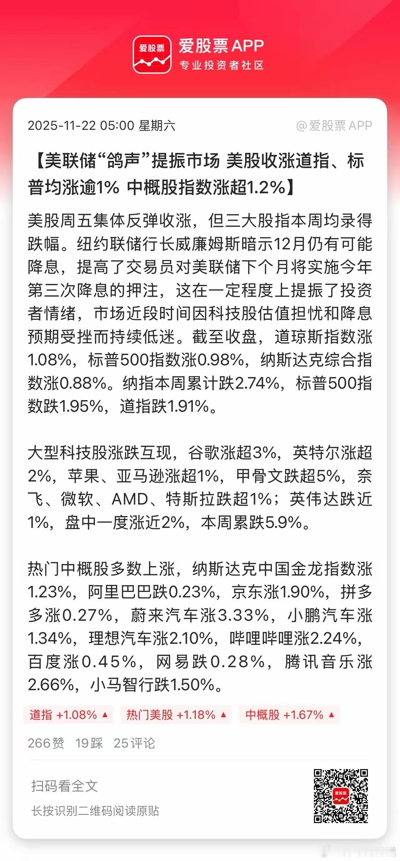 昨晚美股尾盘又跳水了,但好歹是大涨的!中概股、A50也大涨。美联储说12月仍可能降息,这句话就像渣男说我还是爱你的!但美国投资者选择了相信。我们A股下周该反弹了吧……