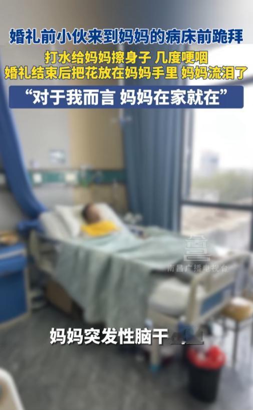 “泪目了!”河南开封,一男子结婚,当打扮好后,却并没有第一时间接新娘,而是来到医院,他双膝跪地,凑到耳边轻声喊:“妈,我今天结婚啦,你看看我帅不帅?”,婚礼结束后他把花放在妈妈手里,没想到妈妈眼角竟流下泪水。网友:百善孝为先。 父母将我们养育长大,付出了无尽的心血和汗水,他们的爱,是无私且不求回报的,所以当我们长大时,也应对父母怀有感恩之心,用实际行动去回报他们的爱。 据媒体11月11日报道,张先生在大喜的日子,打扮好后第一时间没有先去接新娘,而是赶到医院病床前,跪在病床前轻声问:“妈妈,你儿子今天结婚,看我帅不帅?”,病床上的人没有回应,他默默为对方擦拭身体,一度哽咽,现场的人也都红了眼眶。 原来这是张先生的母亲,他从小没了父亲,由母亲抚养长大,几年前母亲突发疾病,不能动也不能说话,于是他白天工作,晚上陪护,从未懈怠。 当婚礼结束后,他将手捧花放进母亲手里,并絮絮叨叨地说着婚礼上的趣事,没想到这时妈妈眼角竟缓缓流下眼泪。 妈妈说不出话,但是面对儿子的牵挂和守护,她都懂,这次办婚礼,对张先生来说,不只是给相恋多年的女友一个正式的交代,更重要的是,他想了却母亲的一桩心事,毕竟那位母亲不想看儿子成家立业,所以,婚礼从筹备到举行,他心里一直惦记着病床上的母亲。 网友看后表示,新娘嫁对了人,一个懂得感恩母亲的男人,一定不会辜负妻子。 信息来源:《河南开封。婚礼前小伙来到妈妈的病床前跪拜,打水给妈妈擦身子几度哽咽,婚礼结束后把花放在妈妈手里妈妈流泪了,“对于我而言妈妈在家就在”》洪观新闻