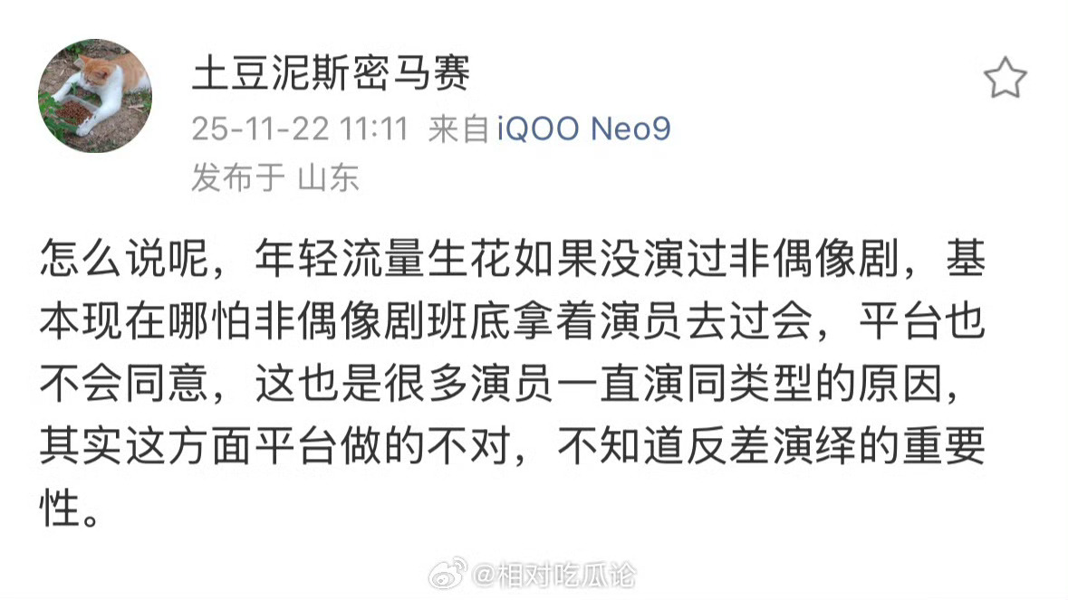 问题是很多流量在偶像剧演技都尬,全靠人设,你敢让他去非偶吗换我我都懒得看