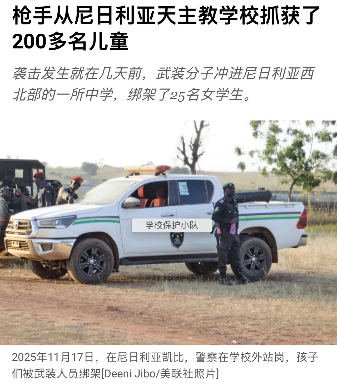 尼日利亚再现“奇博克噩梦”!215名少女被武装分子集体绑架 11月21日凌晨,尼日利亚尼日尔州圣玛丽天主教寄宿学校遭上百名富拉尼武装分子突袭,215名12-17岁女学生连同12名教师被掳走。 袭击者踹开宿舍门,将学生强行带入丛林,每人索要1亿奈拉(约48万人民币)赎金。这是本周尼日利亚第二起大规模校园绑架案。 联合国谴责此为“战争罪”,特朗普政府称正密切关注并考虑干预。尼日利亚军警已展开大规模搜救,但至今无人获释。 2014年奇博克276名女孩被绑案中,至今仍有上百人下落不明。这一次,历史会重演吗?