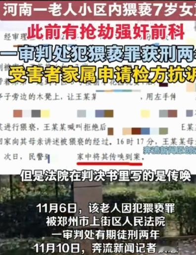 河南郑州,一名7岁女童在小区内玩时,被同小区一名60岁老人诱骗至花园,并在公共场所实施猥 亵行为。女童反抗逃离后,母亲果断报了警,老人被抓后,家属提起附带民事诉讼索赔350000元,法院的判决,却让家属大失所望。 事发当天傍晚,小雅刚放学,背着粉色书包,与几个小伙伴一边跑一边聊着学校里发生的小趣事。 就在这时,殷某慢慢地靠近了孩子们。 他在小区里住多年,对每一条楼道、每一个花坛都非常熟悉。他手里拿着一个小纸袋,开始试图接近小雅,用温和的语气说着:“小朋友,我这里有糖果,要不要尝一颗?” 他的语气轻松,仿佛在和孩子们开玩笑。小雅的朋友们一边摇头,一边向小雅提醒要小心,但小雅天真地认为对方只是善意的人,心里也稍微有些好奇,慢慢地走近了殷某。 他又说:“我这里还有小猫咪,要不要去看看?” 小雅的好奇心被激发,她想起平日里喜欢的小动物,犹豫了一瞬,便跟着殷某走向小区一角偏僻的花园。那条小径被几株灌木遮挡,平日里孩子们很少单独走到这里。 随着他们逐渐远离活动区,小雅开始感觉到一丝不安。她的心跳开始加快,脑子里闪过老师和父母平日教导的“陌生人不要随便跟随”的警告。 她用力挣脱开殷某的拉拽,快速地转身向小区活动区方向跑去。 小雅一边跑,一边喊着:“妈妈!妈妈!”声音带着哭腔,却充满紧迫感。楼道里的邻居听到声音,也纷纷回头看,她终于冲进了家门,扑进母亲的怀里。 小雅母亲此时正准备晚餐,一看到女儿惊慌失措的模样,立即意识到事情不对。 小雅泣不成声地把刚才发生的一切说给母亲听,母亲一边抱着女儿,一边安慰她:“没事了,妈妈在这里,妈妈保护你。警察叔叔马上就来。” 不到十分钟,辖区派出所民警便赶到现场。母亲带着小雅指认了小雅所说的花园角落,民警立即展开调查,调取监控录像,询问目击居民,并记录小雅的陈述。 小雅虽然仍有些惊魂未定,但在母亲陪同下,努力配合民警讲述事情经过。母亲在旁边看着民警行动,心里既焦急又庆幸女儿及时逃脱,决定一定要通过法律手段让施害者承担责任。 民警通过调取小区监控和走访目击者,很快锁定殷某身份,并将其带回派出所。讯问过程中,殷某承认了主要违法行为。 进一步调查显示,殷某曾因类似案件被处理,具有相关前科。小雅家属对此愤怒不已,认为“明知有前科仍再次作案,危害社会严重”。 在刑事案件审理期间,家属通过律师提出刑事附带民事诉讼,要求殷某及家属赔偿35万元,包括精神抚慰、心理治疗、误工费及护理费用等。 家属在起诉书中指出,这起案件对孩子心理造成严重影响,赔偿用于帮助孩子恢复正常生活和心理健康。 检方指控殷某利用熟悉环境,专门针对幼女实施猥亵行为,并在公共场所作案,社会危害性大。 法院在判决书中指出,殷某虽有前科,但不构成法律意义上的累犯;女童及时逃脱,未造成更严重伤害;其悔罪态度有限。 综合考量犯罪事实、社会危害性和法律规定,法院最终判处殷某有期徒刑2年。 同时,家属提出的35万元赔偿诉求因证据不足,未获得全部支持,仅判令承担部分精神损害抚慰金及相关费用。 案件曝光后,网络上迅速掀起热议,短时间内相关话题登上热搜,评论区几乎被家长、网友以及法律关注者占满。 许多人对法院的判决结果表达强烈不满,不少评论充斥着愤怒和焦虑:“两年?太轻了!根本没有威慑力,这种人将来还会继续害人。” 更有激烈言论提出,“就应该判死刑”,体现出公众对儿童安全的极度关切和对犯罪行为零容忍的心理。 同时,也有网友从家庭视角发声,描述自己的焦虑与恐惧:“每次放学都提心吊胆,不敢让孩子独自下楼玩。” 有人反思现实社会对未成年人保护的不足:“光靠法律判刑是不够的,社区、学校和家长都应该加强监管。”