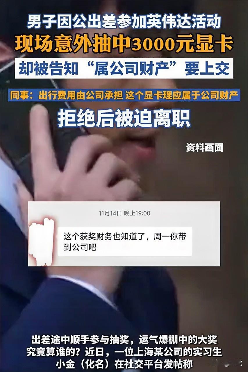11月21日,一位上海某公司的实习生李华(化名)在社交平台发帖称 自己因公出差 在活动现场参与集章抽奖 意外抽中了一张价值约3000元的电脑显卡 然而随行的公司同事 告知他“显卡属于公司财产 财务已经知道了,需要上交” 之后在与公司多轮“约谈”后 公司却暗示他“另谋高就” 此事在网络上引发热议 世界之大,无奇不有