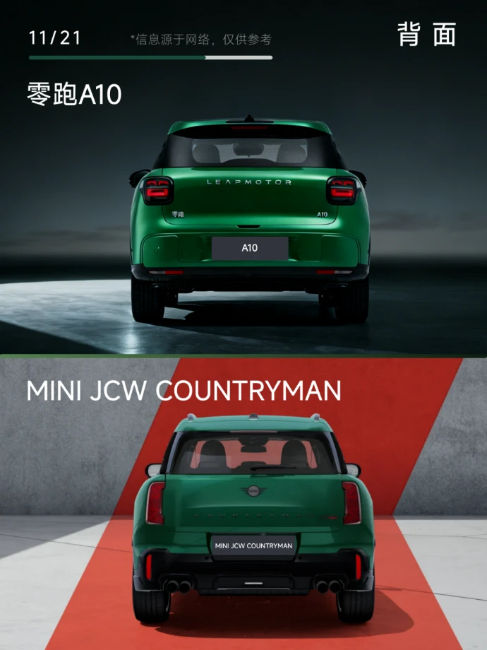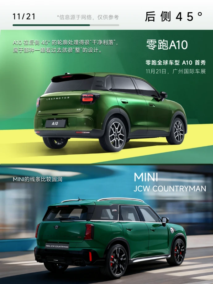 后侧45°:细节设计藏着不少惊喜!A10的轮廓处理得干净利落,整个尾部看着特别“整”,LEAPMOTOR的标识一摆,精致SUV气质比MINI的圆润线条更鲜明。