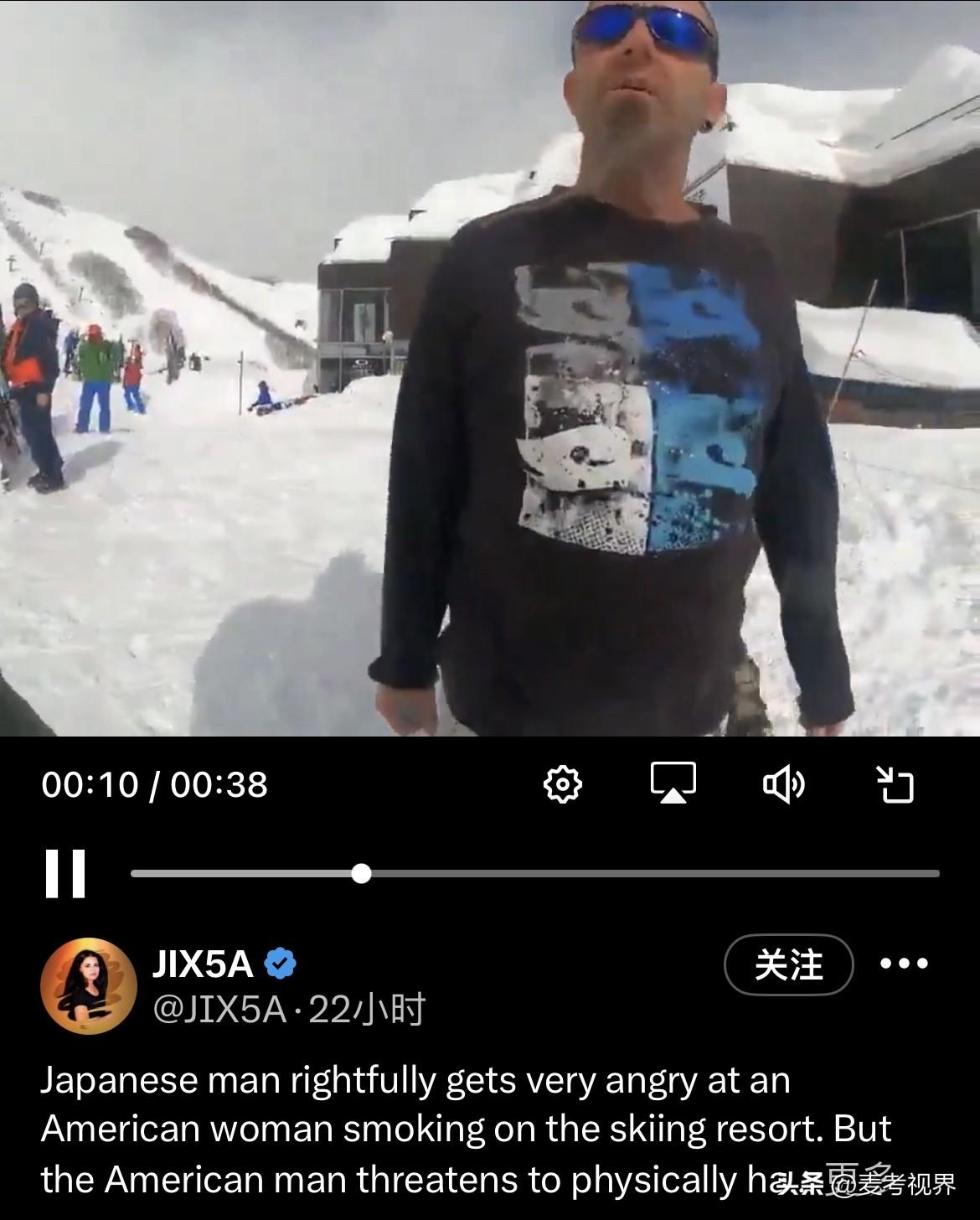 一对操澳洲口音(自媒体误认为是美国人)的白人夫妻在一家日本滑雪场游玩,女的在炊烟,引起在场一位日本男子不爽。这完全可以理解。但那名澳洲男子竟然威胁要打这名日本男子!可以这么说,这一对白人夫妻的公德实在太差了。 在日本,公共开放空间吸烟是绝对禁止的,有着非常严格的规定。而这对傲慢的澳洲夫妻竟然在严禁吸烟的滑雪场吸烟,一点公民意识都没有。 有趣的是,整个日本媒体对此一言不发,这对夫妻要是东大人,不知道日本和港台的媒体要如何吐槽咱们了。也不知道什么原因,特别是港台地区的一些人,为何特别喜欢揪住东大人的一些小节进行放大攻击?尽管咱们确实有一些小节需要改进。