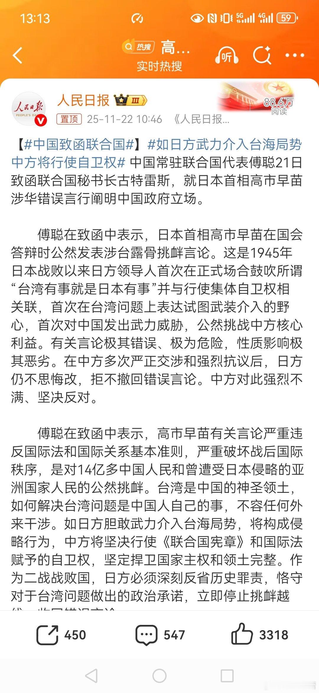 【】 有理有据,先礼后兵,通告联合国成员国,这是中华民族一贯以来的美德!将日本的倒行逆施行为公告于天下。 坚决支持中国政府的立场,如果日本胆敢武力介入台海局势,中国必将视日本为侵略行为,必将对日本迎头痛击!东风快递送到东京! 若日本再次实施侵略政策(如军事扩张、领土挑衅或直接武力威胁),中国、美国、俄罗斯、英国作为联合国创始成员国(联合国安理会常任理事国),有权依据《联合国宪章》中的“敌国条款”直接对其采取军事行动,无需联合国安理会授权。