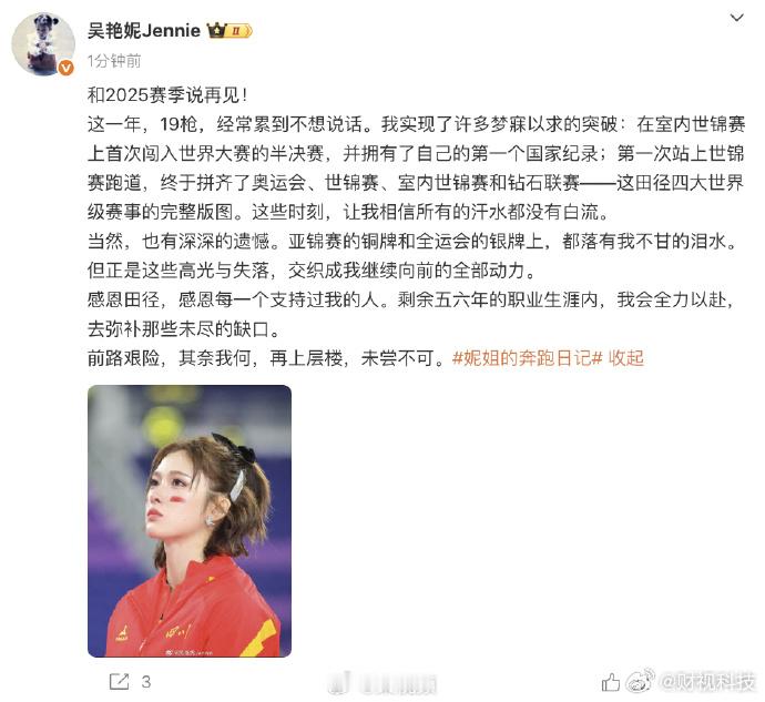 【】 11月22日, 全运会后发文:和2025赛季说再见!这一年,19枪,经常累到不想说话。我实现了许多梦寐以求的突破:在室内世锦赛上首次闯入世界大赛的半决赛,并拥有了自己的第一个国家纪录;第一次站上世锦赛跑道,终于拼齐了奥运会、世锦赛、室内世锦赛和钻石联赛——这田径四大世界级赛事的完整版图。这些时刻,让我相信所有的汗水都没有白流。当然,也有深深的遗憾。亚锦赛的铜牌和全运会的银牌上,都落有我不甘的泪水。但正是这些高光与失落,交织成我继续向前的全部动力。感恩田径,感恩每一个支持过我的人。剩余五六年的职业生涯内,我会全力以赴,去弥补那些未尽的缺口。前路艰险,其奈我何,再上层楼,未尝不可。