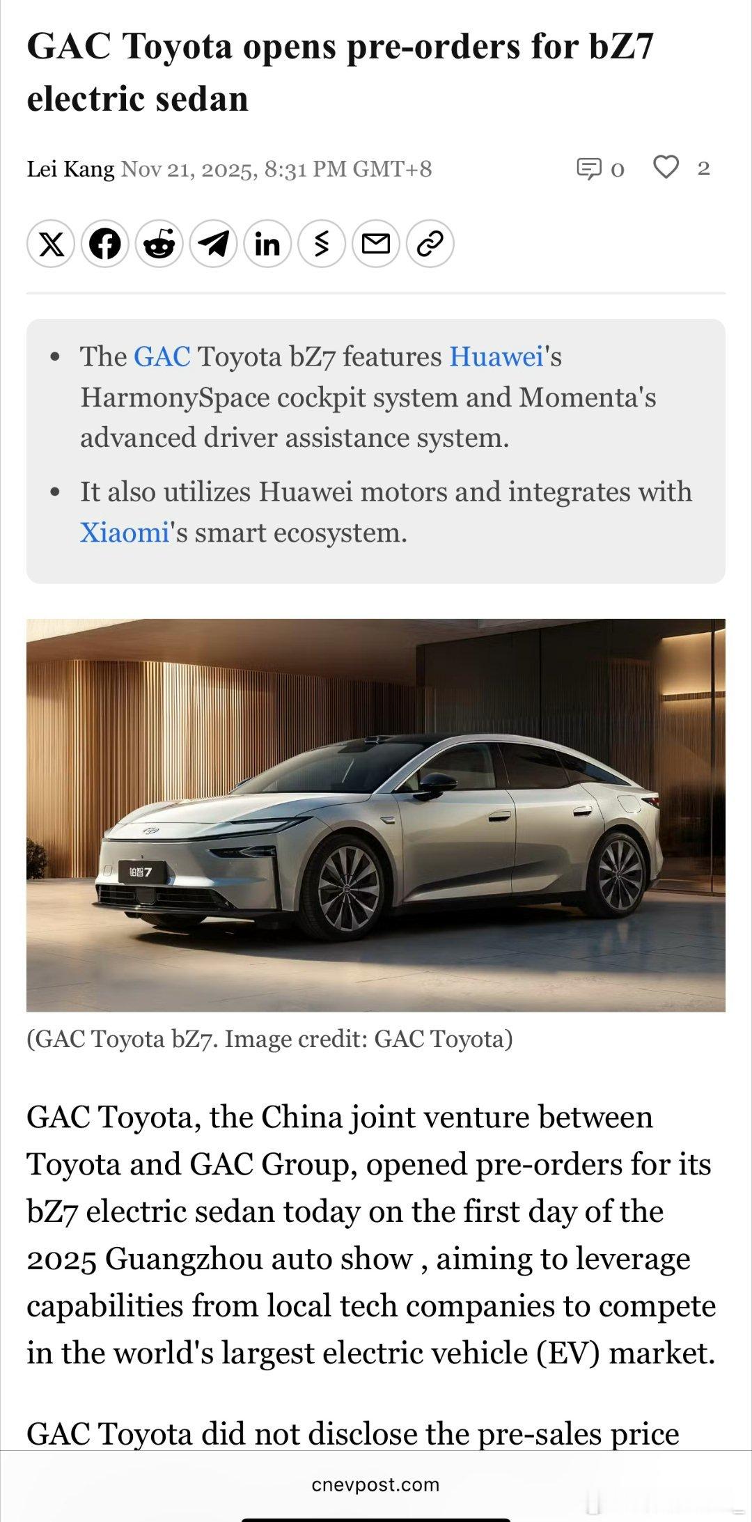 在昨天看见别人在广州车展实拍的铂智7之后,我其实更加坚定了我对铂智7看起来不像是个“典型”日系车反而更像是中日混血车的看法,因为铂智7属实是有点太先锋了反而让我有点不太适应今天看到更多的内饰实拍图,我其确实感受到了铂智7在内饰上的用心。大面积的软性包覆,大面积的木饰板,大面积的打孔真皮都把铂智7的内部空间营造出了一种既有氛围感又不失层次感的优雅,这一点上你似乎可以窥见一点雷克萨斯的影子。同时,鸿蒙座舱、激光雷达和双腔空悬的加入又让铂智7在一种合资车里显得异常得“卷,甚至和不少国产新能源都有一拼之力”。论尺寸论空间论内饰层次和智能座舱体验,考虑到铂智7也就是20万价位段的车型,真的可以说是非常超出预期。所以我看了下很多外媒在评价铂智7的时候也都提到了丰田集团在通过和国内的移动科技厂商合作,使用双擎技术来应对中国市场这一更多元竞争更激烈市场的竞争,我估计老外看见这么一台车要价也就3万刀估计内心是崩溃的,这车在他们那要个4-5w刀绝对没问题,也就是中国市场有这样的福利待遇了