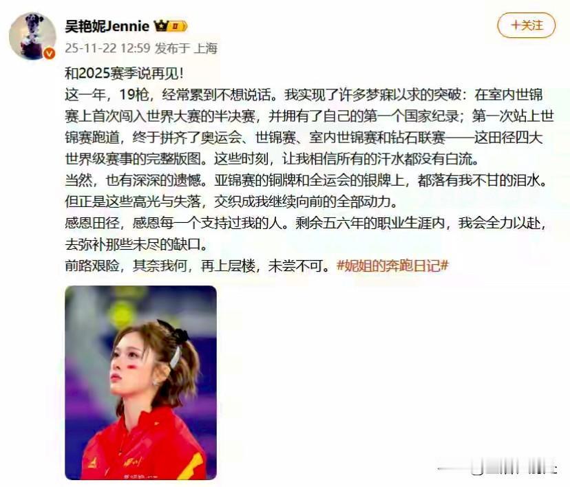 从配图来看,那个自信又坚毅的吴艳妮又回来了……从全运会100米跨栏颁奖现场哭得梨花带雨,到今天,她发布个人动态,全文共230字左右,总结和回应了大家关心的问题。 一、回顾2025赛季,拼齐了四大世界级赛事的参赛版图,虽常感疲惫,但实现诸多突破。 二、有遗憾,而且是深深的遗憾。那就是亚锦赛的铜牌和全运会的银牌。 三、关于未来,在剩余五六年职业生涯里,会全力以赴,弥补不足。 四、一张配图,是她在全运会颁奖仪式上的照片,照片中的她身着红色运动服,妆容精致,眼神望向远方,展现出她的不屈与坚毅。 【评一句】:老实说,自刘翔之后,吴艳妮让很多人关注了跨栏这个项目,她在这个项目上展现的自信和对胜利渴望的不掩饰,正是运动员的一种精神。