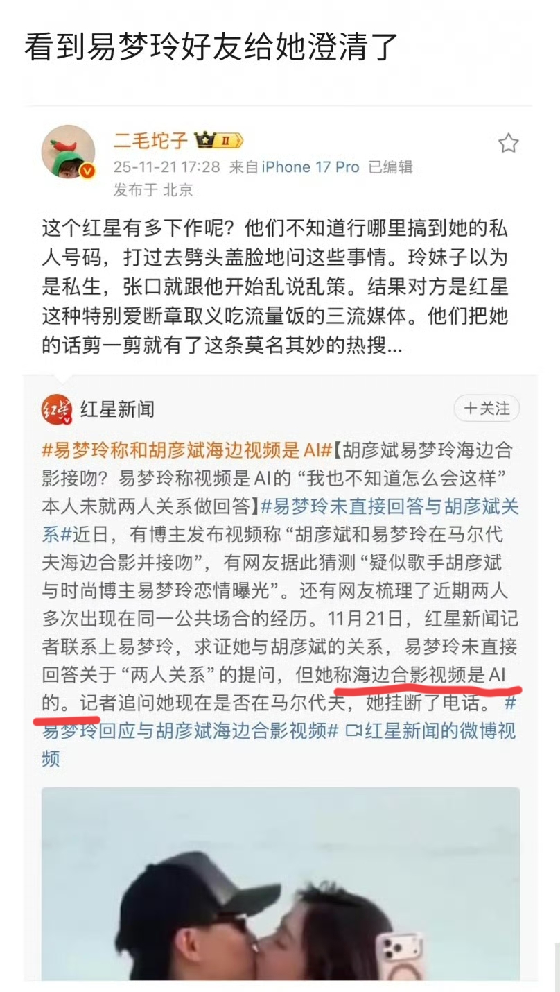 近日,有媒体就胡彦斌和易梦玲在马代海边亲吻的视频求证易梦玲,没想到易梦玲竟然一口否认说视频是AI合成的,而且还说很好笑,就挂断了电话。