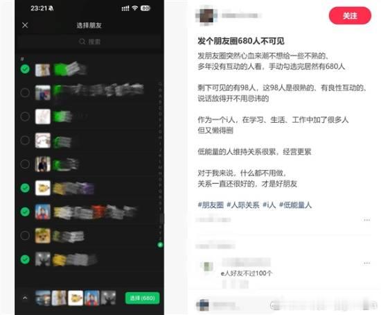 发个朋友圈手动勾选680人不可见 引发网友热议11月21日消息,微博话题“发个朋友圈680人不可见”上了热搜榜,引发热议。一位网友在社交平台发帖称,他发朋友圈突然心血来潮,不想给一些不熟的、多年没有互动的人看,手动勾选完居然有680人,剩下可见的有98人,这98人是很熟的、有良性互动的、说话放得开不用忌讳的。作为一个i人,在学习、生活、工作中加了很多人但又懒得删,低能量的人维持关系很累,经营更累,所以什么都不用做关系一直还很好的才是好朋友。这条帖子引发热议,评论区有网友表示,手动勾选680人太累了,还有网友建议加个标签,下次直接勾选标签里的不可见。有调查显示,不少人的微信朋友圈设置“三天可见”,缩小朋友圈记录的查看范围。支持者认为理应保护隐私,而反对者认为会导致“友尽”。一位网友说,朋友圈里并非全都是朋友,有时候一起开个会,初次见面的人加个微信很正常,可能以后很少有机会再见面,但互相之间却能通过朋友圈了解对方很多涉及隐私的生活细节,“三天可见”正是应对这种情况所出现的功能。