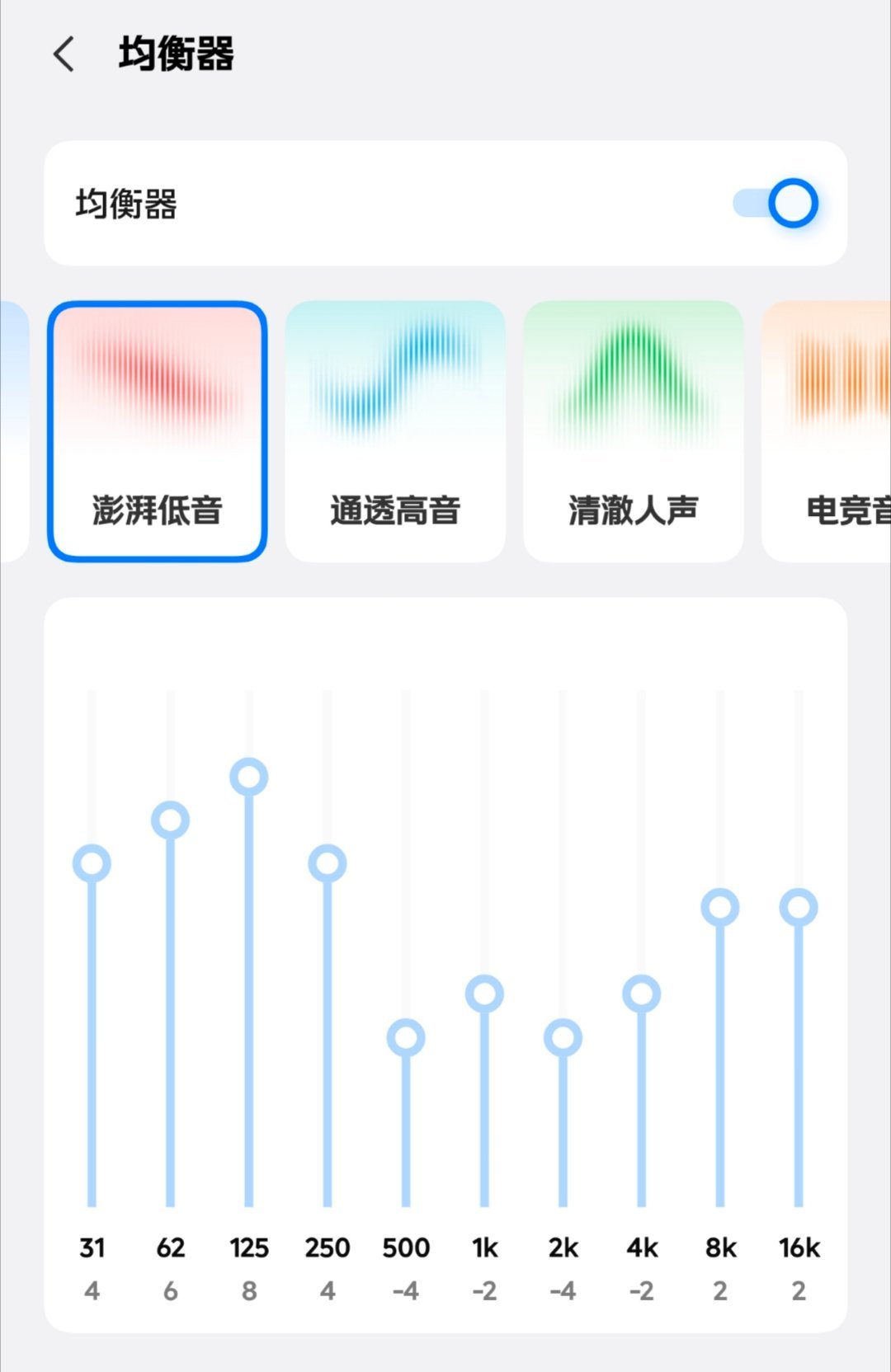 iQOO 15更新22.27系统之后新增了全局均衡器功能,注意是“全局”,图二预设的澎湃低音我试了下,听感很不错啊