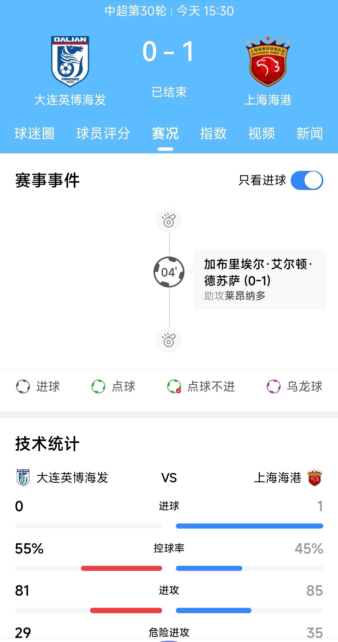 大连英博尽力了,面对上海上港实际上大连英博的控球率与射门次数都占据了优势。只可惜还是0:1输掉了比赛,这样的话上海申花即便3:1战胜天津也无缘中超联赛冠军,遗憾的拿到了第6个亚军。 现在想想如果第28轮上海申花主场能赢下大连英博,那么中超联赛冠军是上海申花。令人欣慰的是上海申花外援实力强大,国内球员发挥稳定,这赛季磨合得很不错。我感觉2026年是上海申花最有希望的一年,相信明年会给球迷带来很多惊喜。