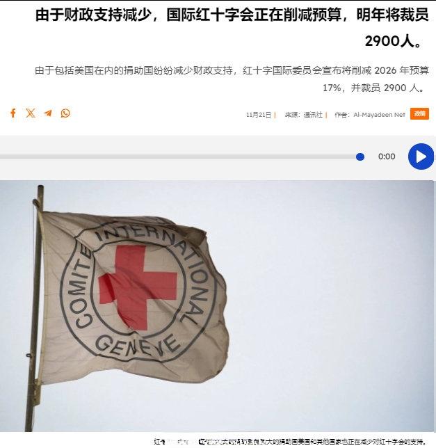 红十字国际委员会宣布,由于其最大捐助国美国和其他国家减少援助,该委员会将削减2026年预算17%,至22亿美元,并裁员2900人。
