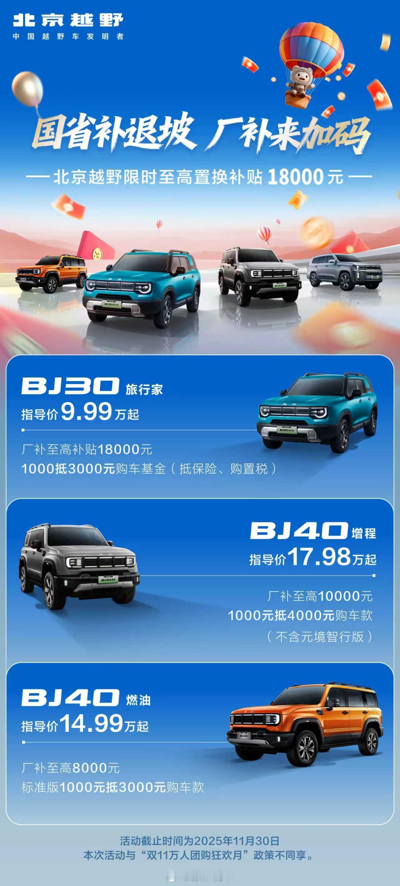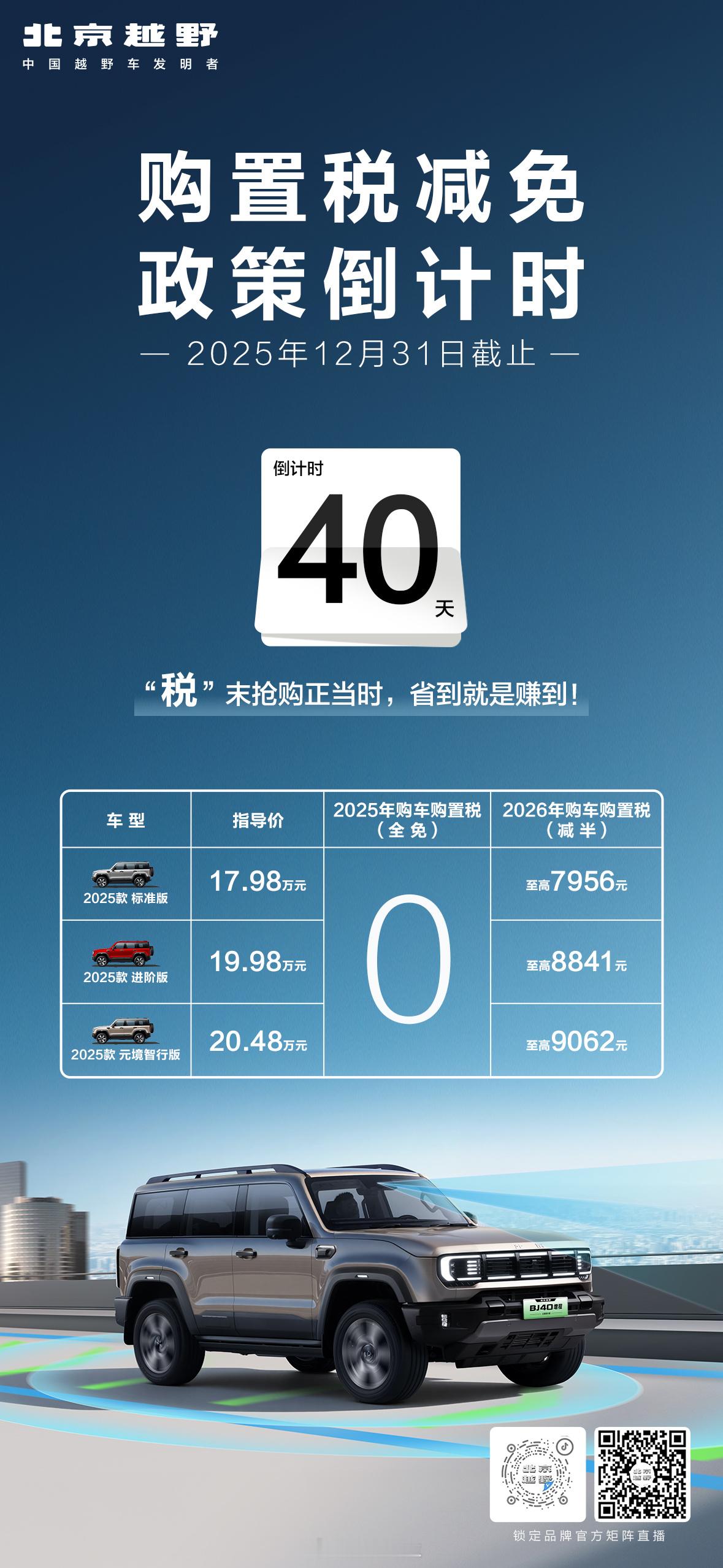 北京越野购置税全免倒计时40天叠加至高18000元厂家补贴省到即是赚到