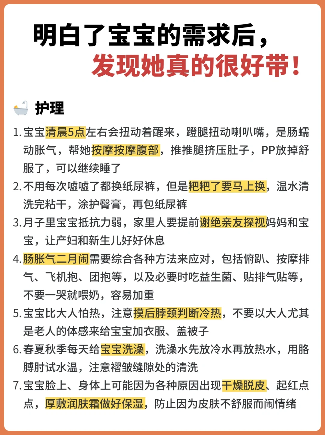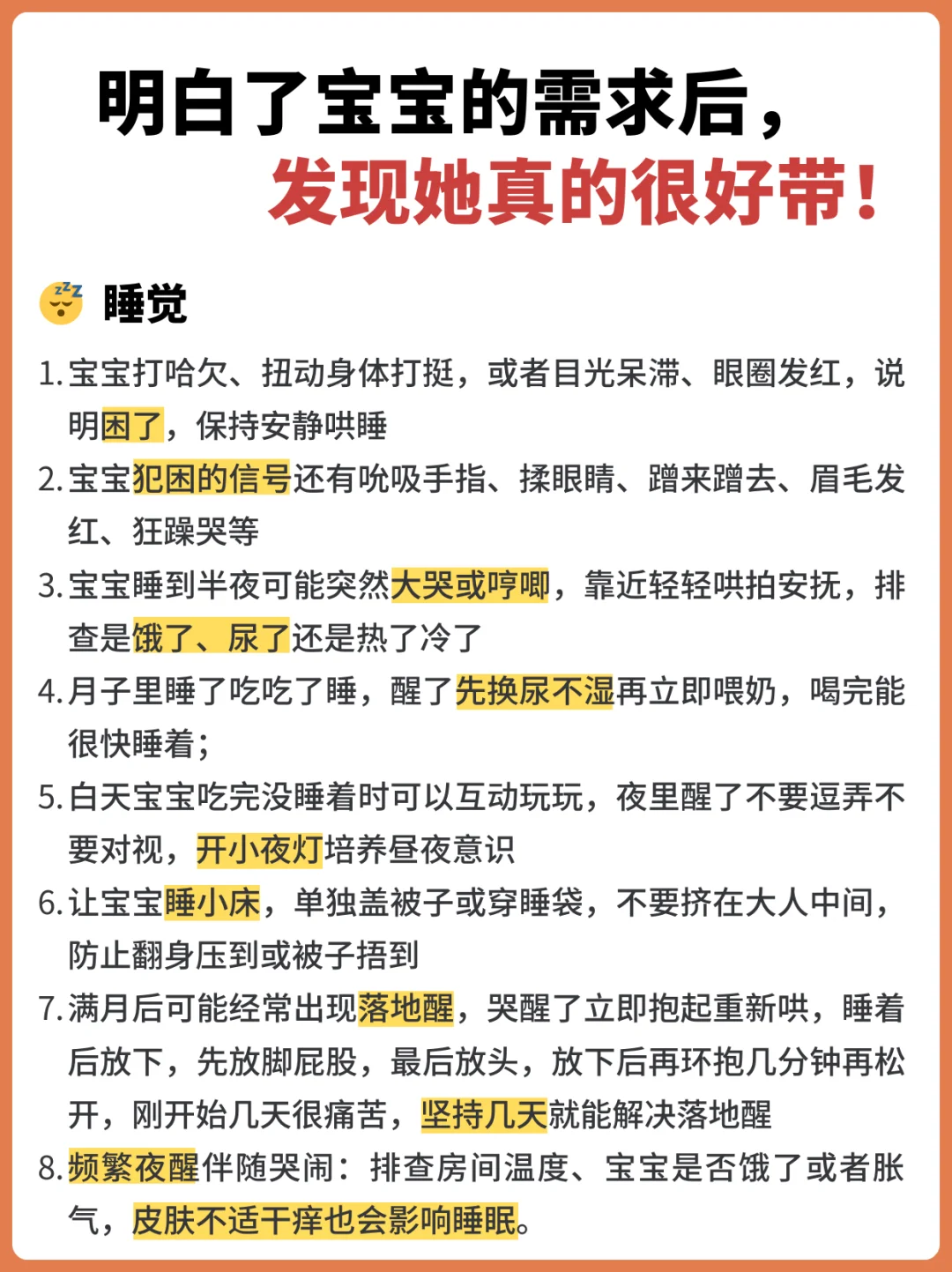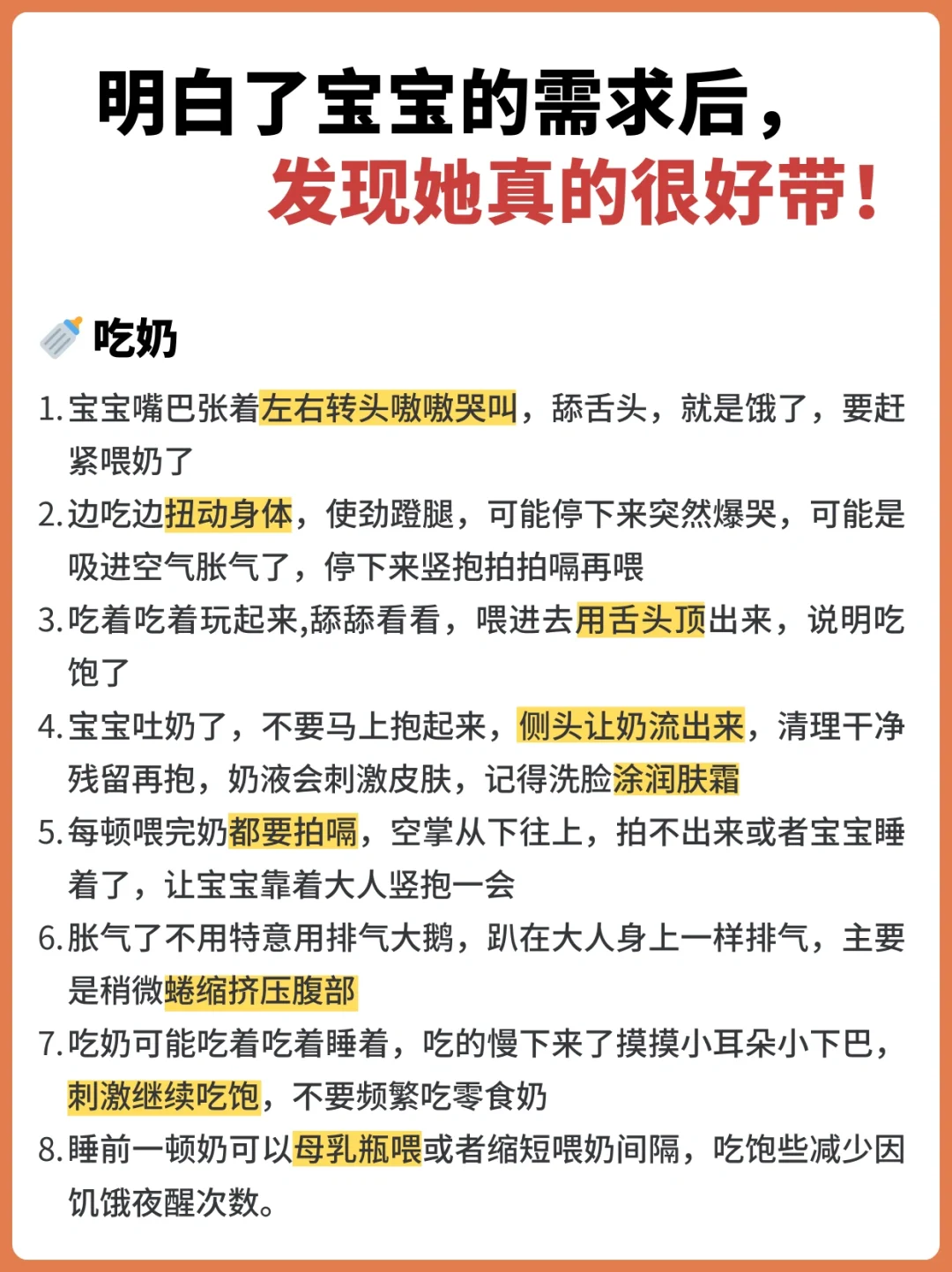 小进步学年 小宝宝需求真的不多,吃睡拉撒玩,只要掌握信号摸透规律,顺着宝宝的意愿,带的很轻松。 ✅1.宝宝睡觉的时候不安稳,左右猛摇晃脑袋,摸摸宝宝的后颈,十有八九微微湿热,被子稍微拉下一点;也有可能是有蚊子咬,别问我怎么知道😭 ✅2.宝宝揉眼睛,打哈欠,眼圈微红,或者安静的待着不动,逗弄也不反应,一般是困了,保持安静立即哄睡。 ✅3.频繁揉脸揉眼睛,扭动身体打挺,哭闹不愿意坐下,很大程度是非常困了,要赶紧哄睡。 ✅4.半夜突然醒来很清醒,吃完奶也不睡,玩着玩着不动了,大概率是拉粑粑了,要检查一下 ✅5.宝宝脸有点红,眼眶周围红红的,静止不动,有明显的使劲的感觉,小手握的紧紧的一般就是正在拉杷粑。 ✅6.宝宝双腿弯曲翘起,腿在空中扭来扭去,是要放屁了,按摩一下肚子,或者推着宝宝的腿给她一个力,或者团抱挤压腹部,很快能排气 ✅7.吃着奶突然变得很暴躁,哼哼唧唧,一般是吸进去了气,停下来竖抱拍嗝,打嗝后再喂 ✅8.宝宝发出“奶奶”的哭声,头左右转,嘴巴一张一合,或者啃小拳头,这是宝宝饿了在找奶,赶紧安排 ✅9.傍晚开始哭闹,很难哄,拱着身子打挺,如果是小月龄的宝宝,这就是肠胀气。白天多趴,做排气操,飞机抱,帮助宝宝缓解,我们会趴在大人身上趴睡,就会安稳一些 ✅10.吃奶的时候睡着了,或者吃着吃着用舌头玩奶嘴,咬揪奶嘴,宝宝吃饱了不要强制喂了 ✅11.吃奶中途不吃了,眼睛直愣愣的看着一个地方愣神,或者睡醒了没有任何声音,可能就是在尿尿,及时换尿不湿 ✅12.睡醒了不哭不闹,自己躺着玩被子,看见人就笑,就是睡饱了 ✅13.睡觉前、吃奶前换尿不湿,宝宝大概醒2-3小时就要睡觉了,记住这个时间周期,调整晚上睡觉时间,规律作息 ✅14.小月龄宝宝哭闹,不是困了,就是拉了尿了,要么就是饿了,可以一一排查,不要一哭就觉得饿了就要喂,防止过度喂养