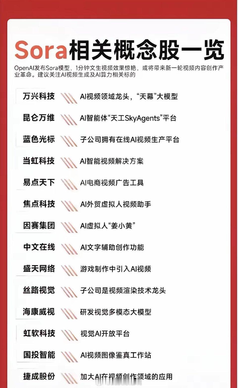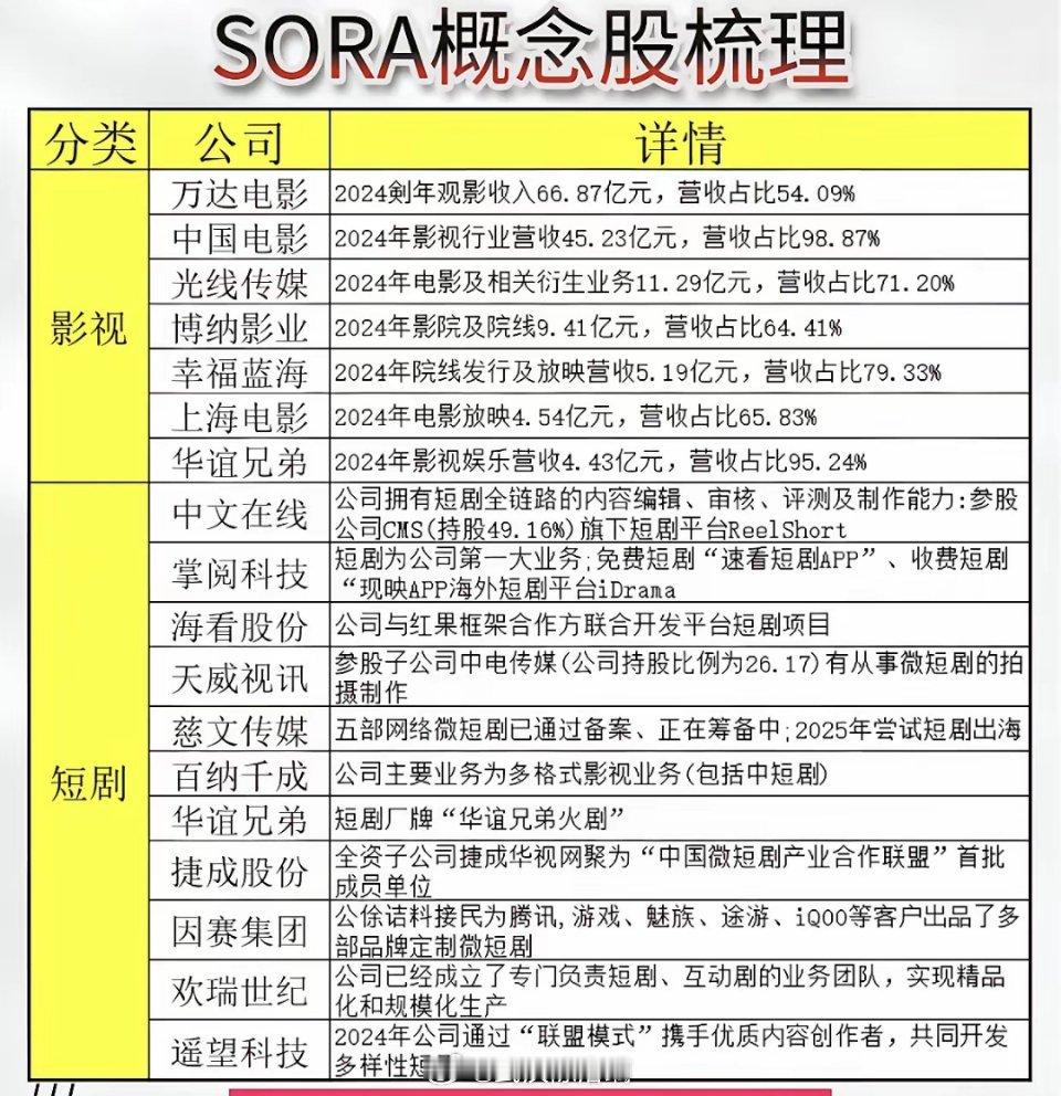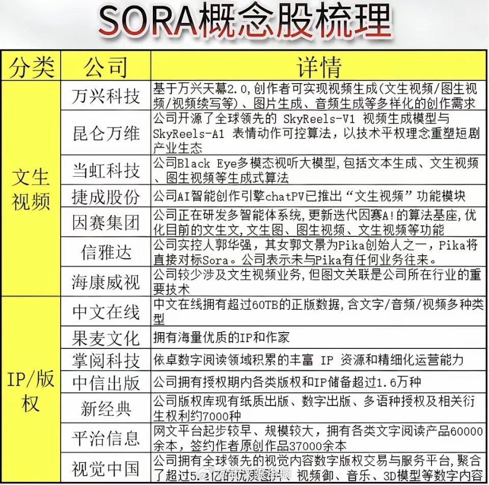 AI视频生成技术崛起,带动产业链爆发。关注万兴、昆仑等龙头布局,虚拟人、广告工具、智能创作引领新趋势。SORA概念股梳理:影视与短剧公司分析!