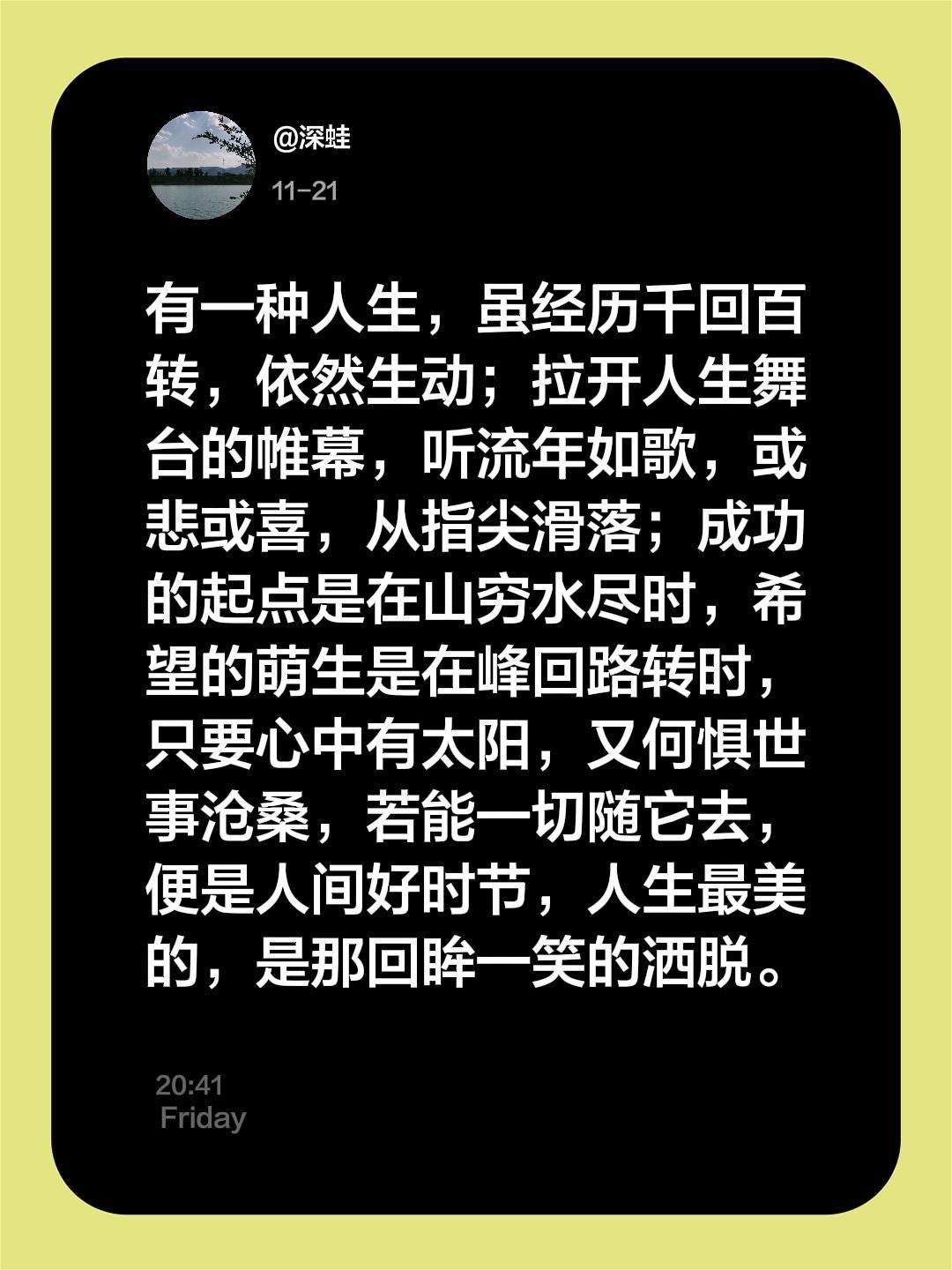 有一种人生,虽经历千回百转,依然生动;拉开人生舞台的帷幕,听流年如歌,或悲或喜,从指尖滑落;成功的起点是在山穷水尽时,希望的萌生是在峰回路转时,只要心中有太阳,又何惧世事沧桑,若能一切随它去,便是人间好时节,人生最美的,是那回眸一笑的洒脱。