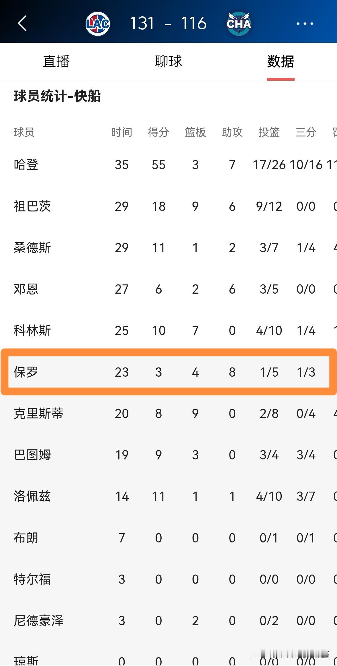 快船老将保罗的投篮真是太糟糕了!在今天快船客场以131:116击败黄蜂的比赛中,保罗替补出战23分钟,投篮5中1,其中三分球3中1非常低效的得到3分,不过有4篮板8助攻,他的场上正负值为+1。 作为一名NBA历史级别的控卫,保罗的控场能力是毋庸置疑的,但是他的投篮命中率真是惨不忍睹。