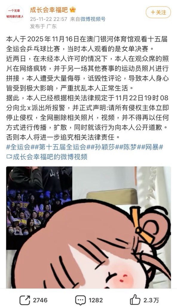 孙颖莎球迷报👮了,起因是她去看了16号的女单决赛,过程也没有吵闹没有麻辣他人,却被恶意拼接到19号的女团决赛,被网宝了
