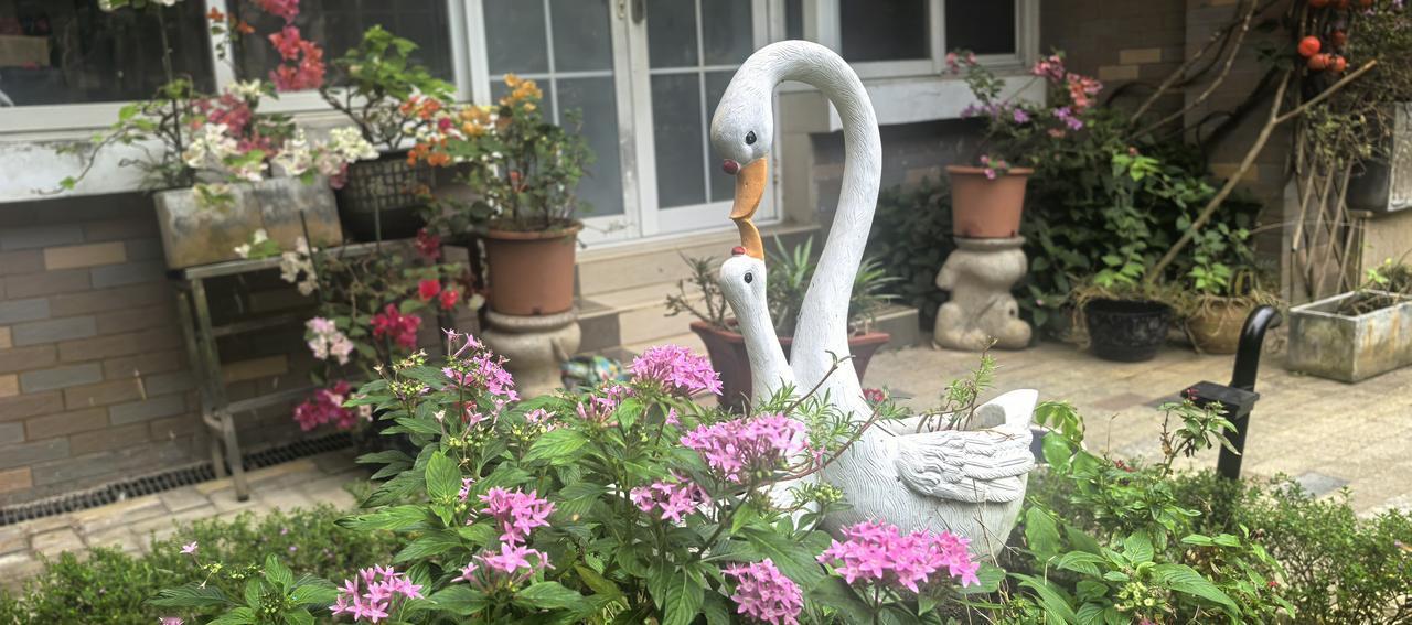 满院茶香敲句轻,一帘花影伴琴声。 天鹅欲去难挥翅,不舍庭前别有情。