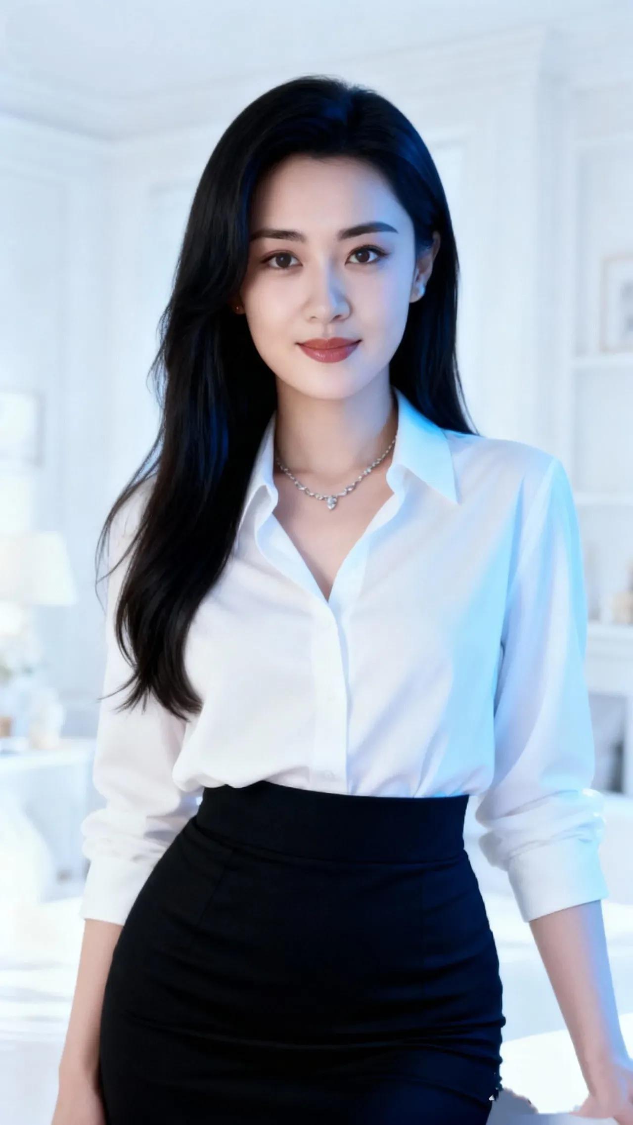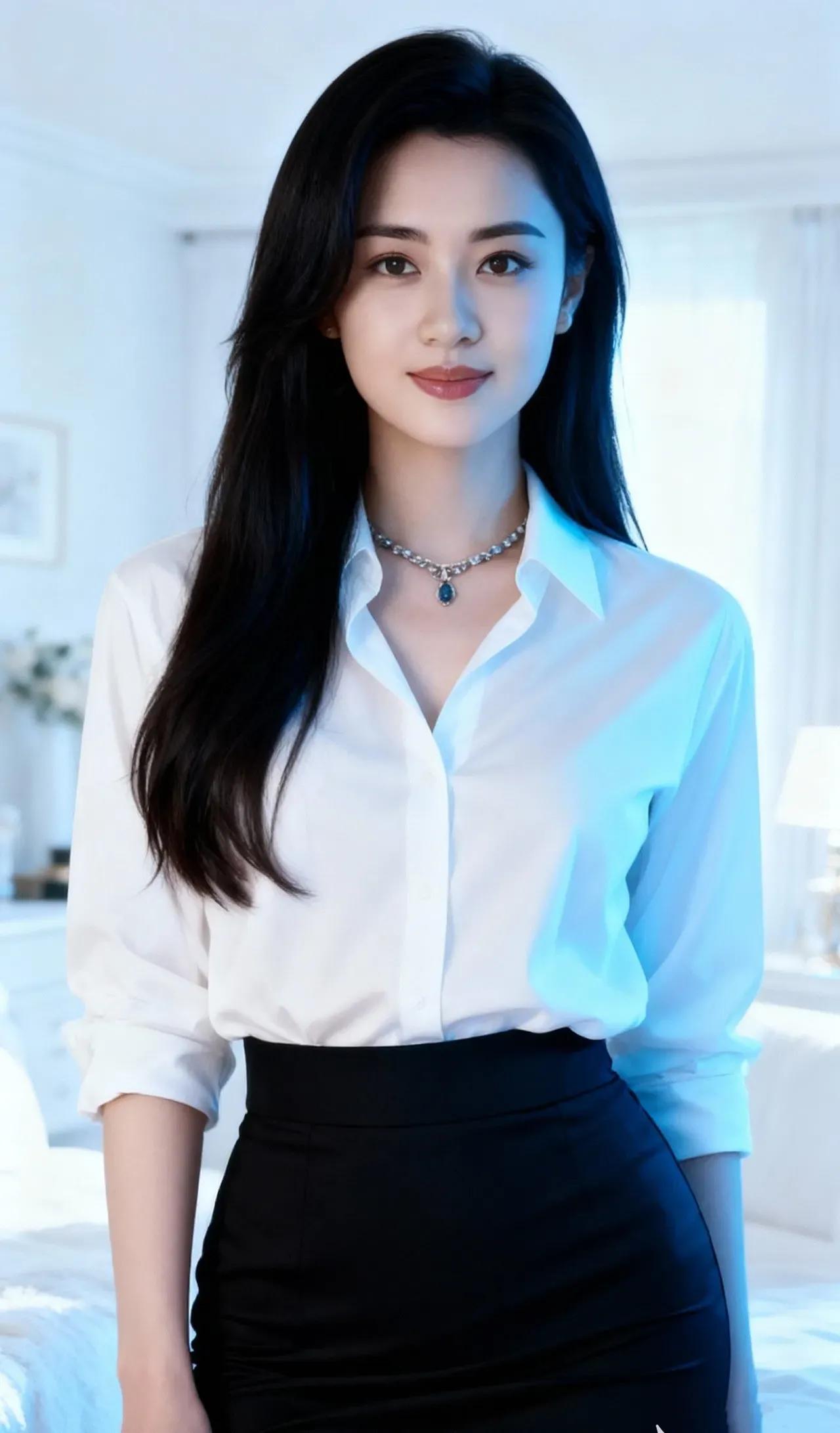 这位美女穿着白衬衫和黑裙子,搭配珍珠项链,显得优雅大方。