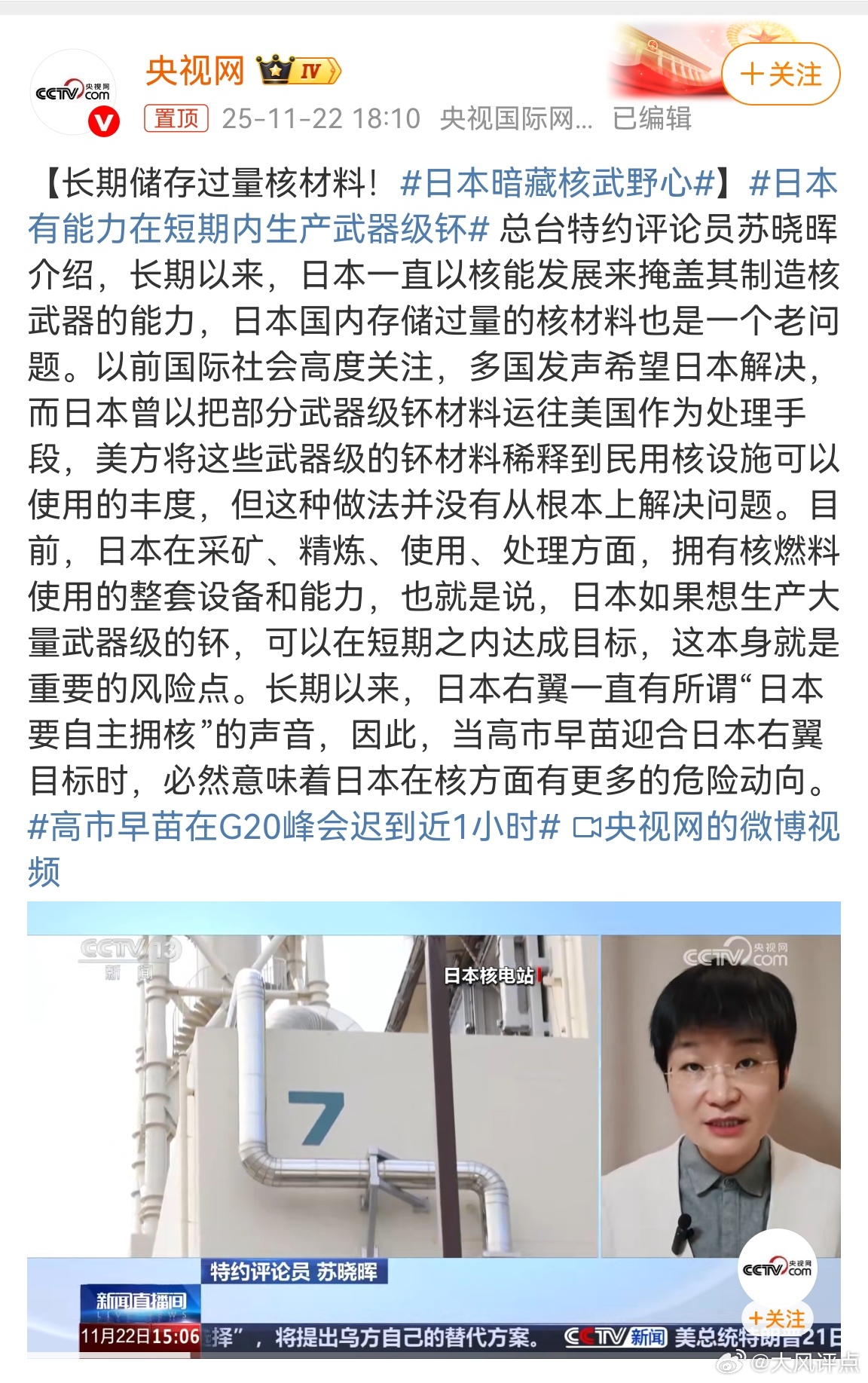核野心昭然若揭 日本拥核风险敲响警钟日本以核能和平利用为幌子,长期囤积超47吨钚(可造6000枚核弹),暗藏武器级核材料,其核野心早已昭然若揭。从完整核燃料循环体系到短期量产武器级钚的能力,日本步步为营突破核约束。高市早苗迎合右翼推动修改“无核三原则”,更是危险信号。美方稀释核材料的敷衍处理,未能堵住漏洞。作为核爆受害国,日本却无视国际关切,妄图染指核武器,不仅践踏核不扩散体系,更给东北亚安全埋下巨雷。国际社会必须严阵以待,遏制其危险试探。