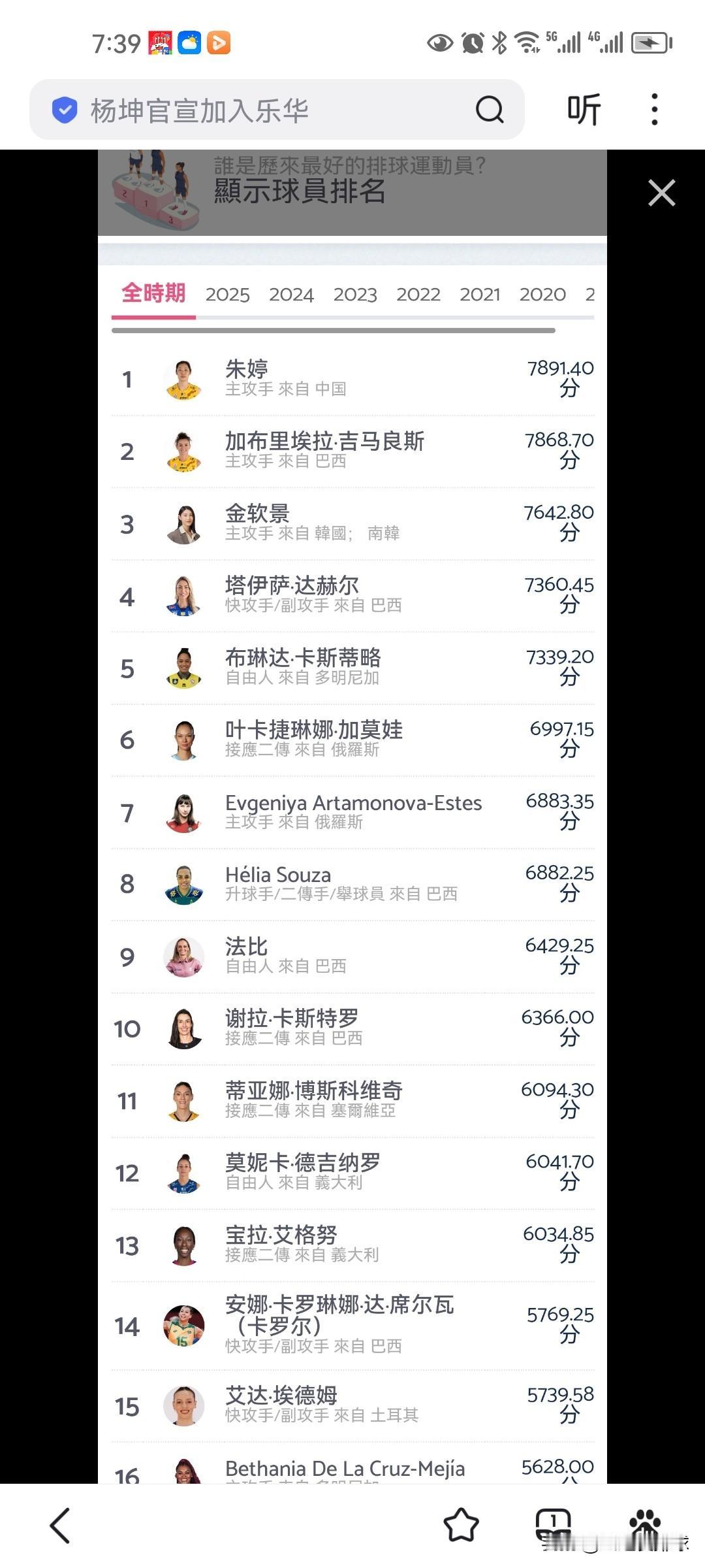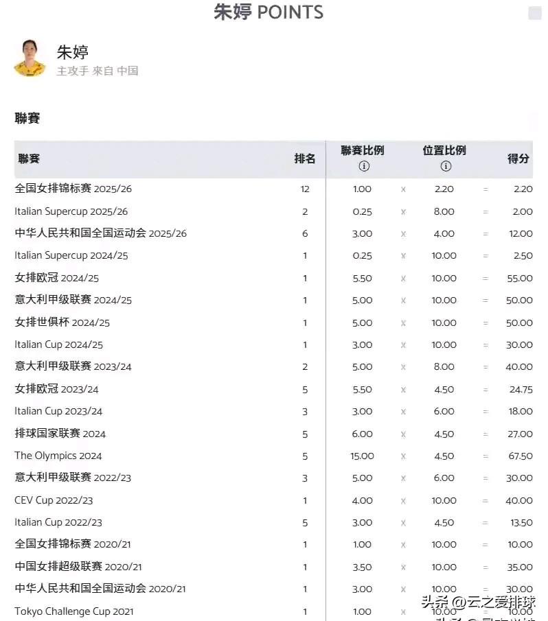 这是一张权威的榜单! 朱婷,你的优秀世界都能看得到,当然黑子除外! 在外网VOLLEYBOX根据世界顶尖运动员,从团体荣誉和个人荣誉相关方面评比! 朱婷以7891.40分排名第一; 然后加比、金软景紧随其后! 这份榜单包含现役和已退役球员! 而相关数据来源,通过全运会、欧冠、意甲联赛、国际大赛等综合评定! 这应该最新鲜出炉的榜单,其中数据上面包含第15届全运会的成绩! 小编惟愿她在意甲开开心心打球,快乐享受排球,远离是非! 不知道11月26日本届欧冠首秀,对阵泽仁体育,朱婷会首发吗?