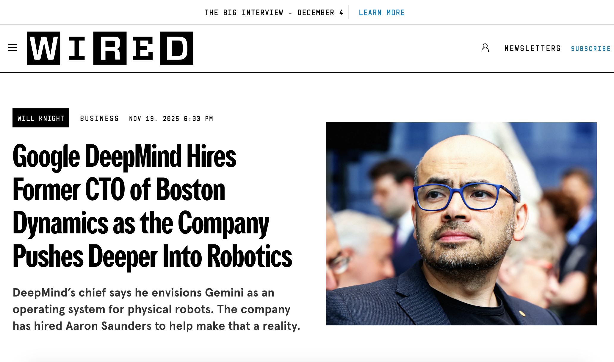 机器人究竟是一个多大的生意,GoogleDeepMind 也正式进场了。刚刚用 Gemini 3 和 nano banana Pro 揍得 OpenAI 一揍一个不吱声的 Demis Hassabis,把波士顿动力 CTO Aaron Saunders 挖来担任硬件工程副总裁。虽说美国硬件除了特斯拉苹果 SpaceX,整体是不大行了,但 GoogleDeepMind 亲自下场而非之前谷歌投资创业小弟的形式,还是不容小觑。Demis 确实很厉害,就凭从 AI 已经无人看好,到 AI 完全追回来这一仗,确实是有可能成为下一任 Google CEO 的。同时期的微软、苹果、亚马逊、Meta,基本已经没有自研 AI 留在牌桌上的了。跑题一句,这个角度看,特斯拉过去 3 年虽说汽车产品线没什么突破,但物理 AI,包括 FSD 和 Optimus 这个细分概念,进展还是非常大的。这个逻辑下,做 CyberCab 砍掉 Model 2 是合理的。