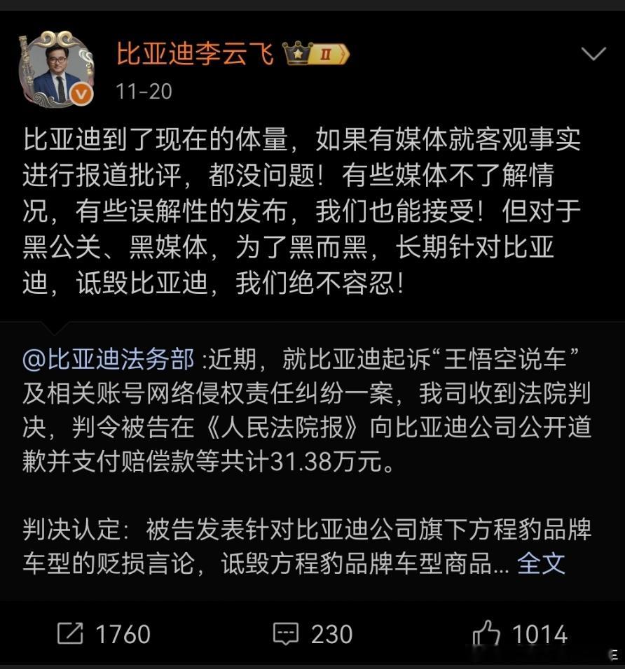 “王悟空说车”侵权比亚迪案判决。被告需向比亚迪公开赔礼道歉,并支付赔偿款等共计31.38万元 。近日,比亚迪起诉自媒体账号“王悟空说车”及相关主体的网络侵权责任纠纷一案尘埃落定。11月20日,比亚迪法务部发布公告披露,法院经审理认定,被告发表针对比亚迪旗下方程豹品牌车型的贬损言论,已构成对企业名誉权的侵害,最终判决被告需向比亚迪公开赔礼道歉,并支付共计31.38万元赔偿款。