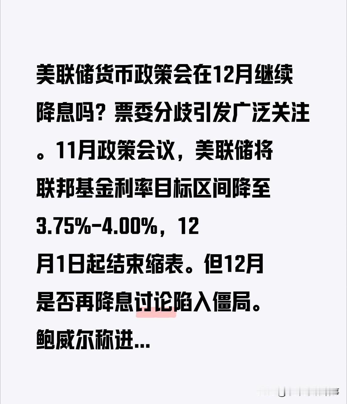 美联储货币政策会在12月继续降息吗?票委分歧引发广泛关注。 11月政策会议,美联储将联邦基金利率目标区间降至3.75%-4.00%,12月1日起结束缩表。但12月是否再降息讨论陷入僵局。鲍威尔称进一步降息“非必然”,认为政策已合适。 此次会议两名票委反对,米兰主张降50基点,施密德主张维持不变。经济走向意见分歧明显,决策更复杂。市场降息预期降低,政策走向受瞩目。