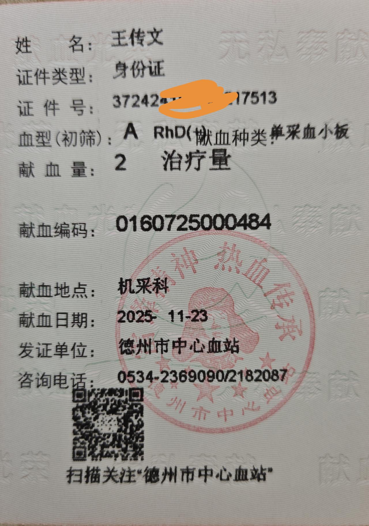 第175次献血第284个治疗量成分血捐献成功。