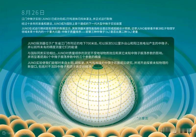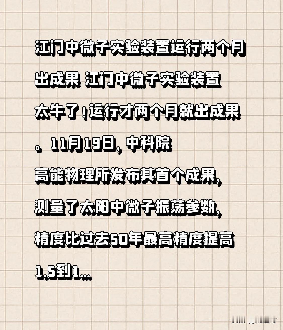 江门中微子实验装置运行两个月出成果 江门中微子实验装置运行两个月出成果 江门中微子实验装置十分厉害,运行仅两个月便有成果产出。11月19日,中科院高能物理所发布其首个成果,测量了太阳中微子振荡参数,精度比过去50年最高精度提高1.5到1.8倍。 该装置位于广东江门地下700米,可探测53公里外核电站产生的中微子。它于2008年提出构想,今年8月正式运行取数。核心探测器直径41.1米,两个月已成功捕捉2379个中微子。关键性能指标全面达标甚至超越预期,相关论文也已提交。这一成果为中微子物理前沿研究开了个好头,未来前景可观! 中微粒子探测器 中微 江门中微子实验