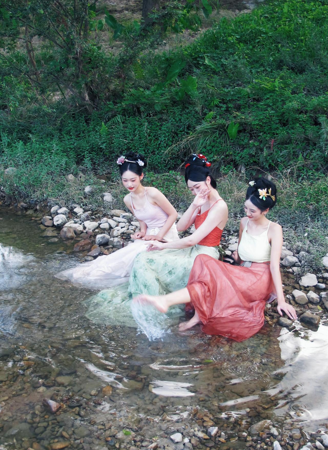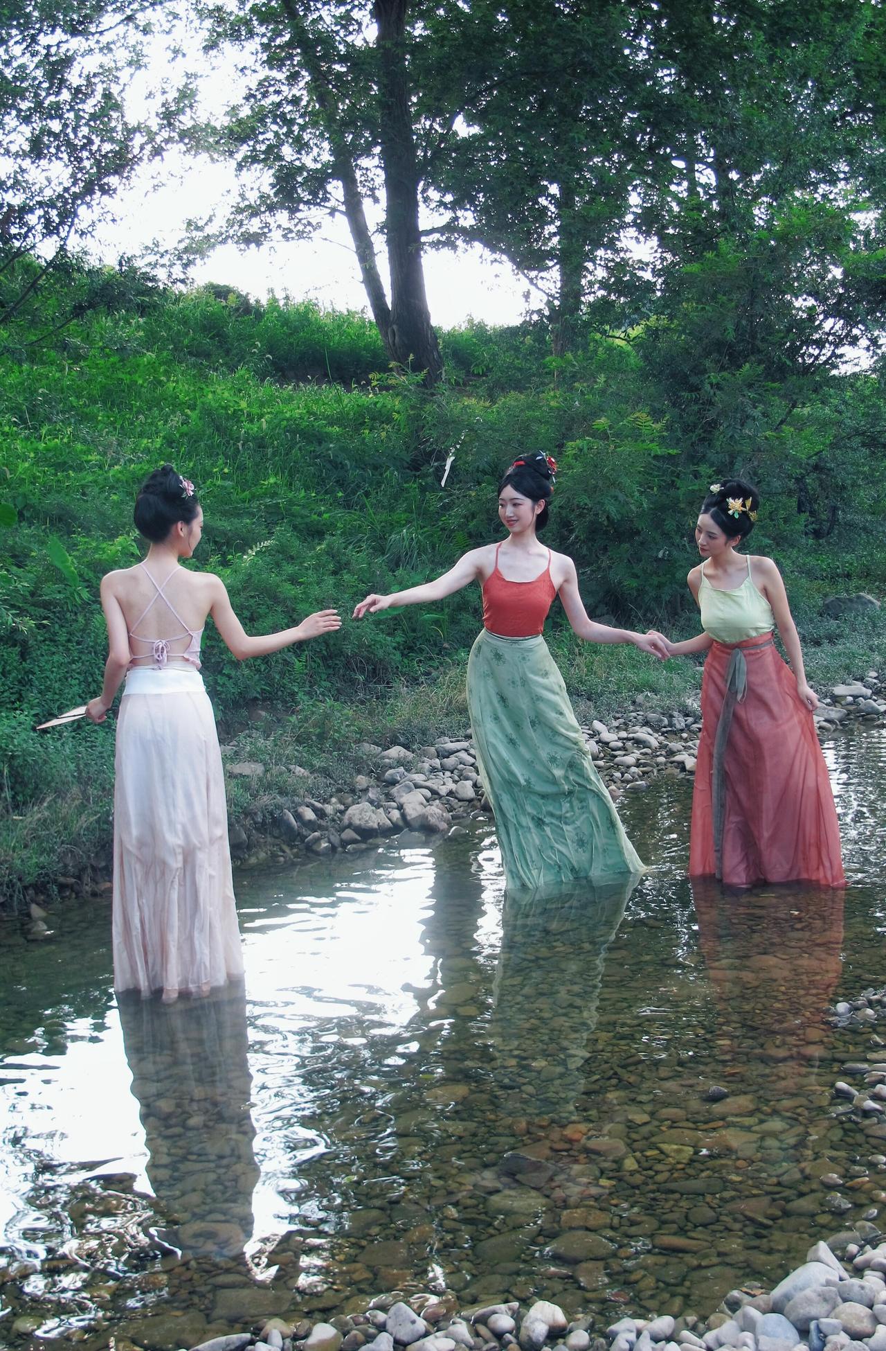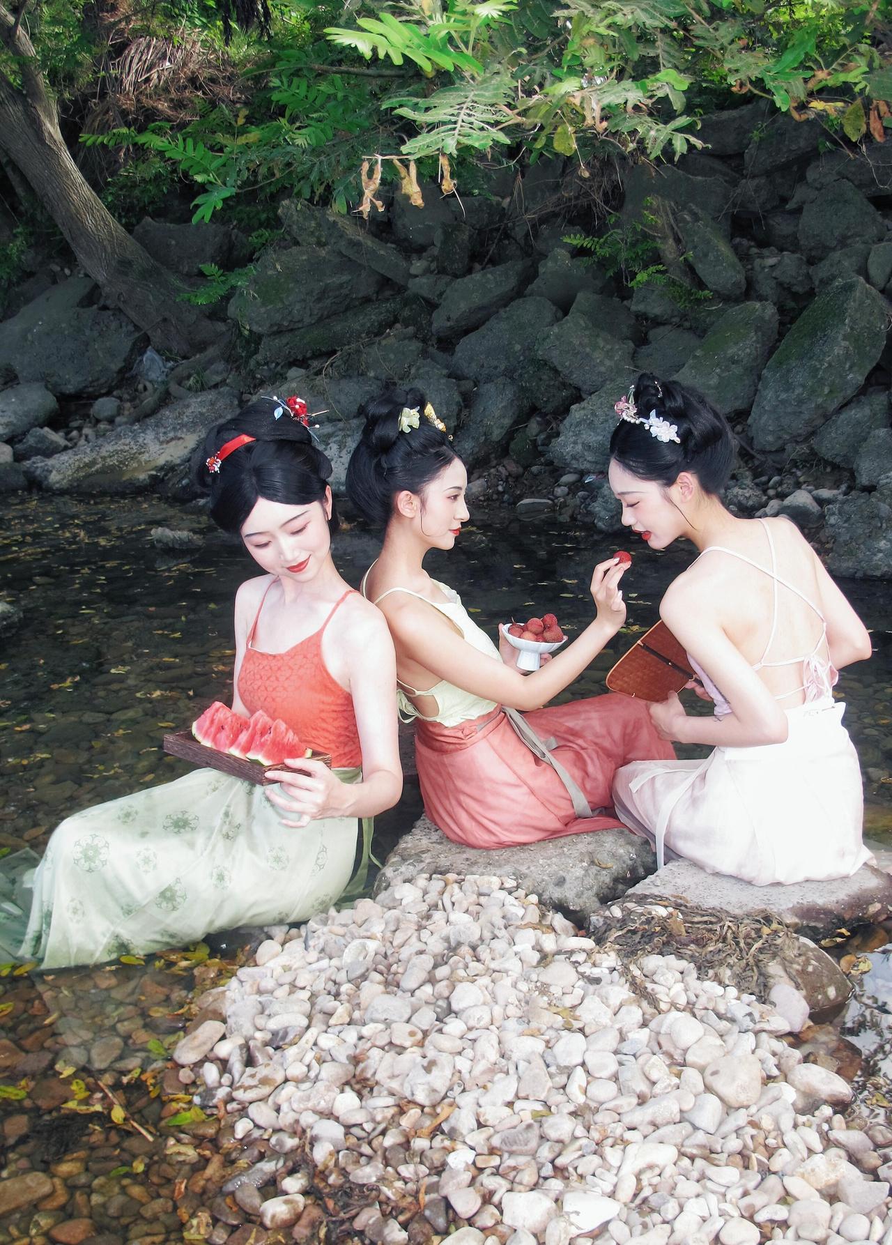 溪光浣碧,裙裾浸暑。 三位宋制汉服仕女自画中来: 浅粉吊带裙曳水,橙红抹胸配青緗褶裙,绛红百迭裙叠翠。 或濯足戏涟漪,或执扇品瓜果,簪花笑语间,将夏日清欢凝于褶裙。 水榭石畔,茶盏浮香,仿若《西游记》女儿国消夏图卷——云影抚眉,荷风梳鬓,青丝绾玉,恰似唐僧误入的避暑仙乡。 = = = = = = = = = = = = = = = = = = = = = = 【📸溪边汉服消夏写真怎么拍出电影感?这组直接封神!】 ✅光线:选下午4 - 6点的柔光,树荫下更柔和,人物面部别有明暗层次; ✅构图:高低机位切换!蹲下拍“濯足戏水”,仰拍显腿长;站高俯拍“围坐品果”,画面更松弛; ✅互动:让模特自然玩水、递瓜果,抓拍笑闹瞬间,氛围感拉满; ✅道具:西瓜、茶具、团扇安排!宋制褶裙配浅色系,清新度💯! (悄悄说:参考《西游记》女儿国剧照摆姿,复古感直接拿捏~)