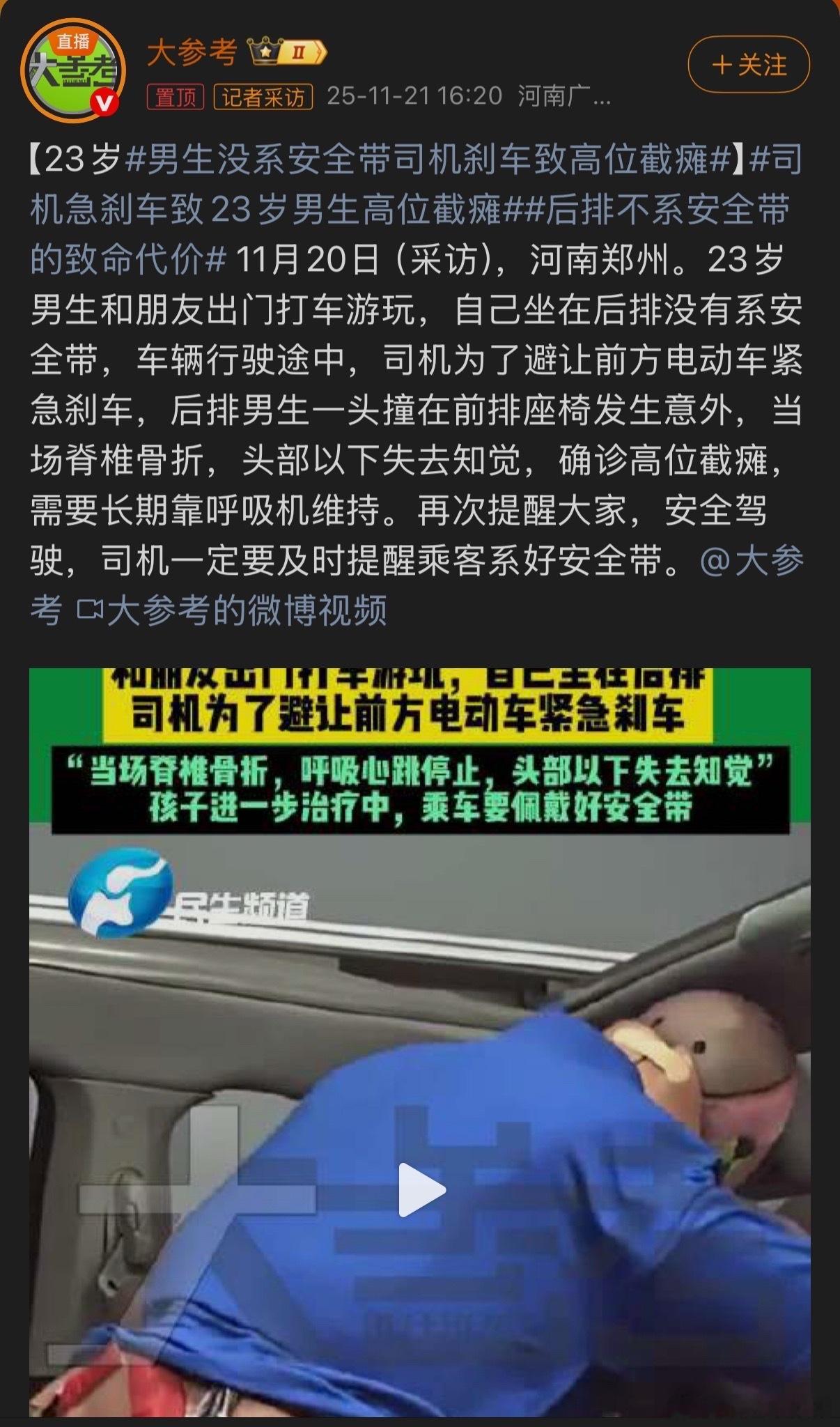 劝别人不系安全带和夸大自动驾驶的人都是非蠢即坏不系安全带时,速度达到40–50km/h时,已有极高概率出现致命或致高位截瘫的重伤。50–55km/h是公认的“生死分水岭”。大量假人试验显示:55km/h 40%重叠正面偏置碰撞,不系安全带时,头部直接撞仪表台或方向盘,颈椎+胸椎瞬间承受几吨冲击力,极易造成高位颈椎骨折→高位截瘫或当场死亡大部分人都觉得不上高速就没事,系安全带时对方还觉得你矫情,可实际案例中:1.2018年中国上海闵行区事故(时速约45km/h)一辆大众朗逸以约45km/h追尾前方货车,驾驶员未系安全带,气囊弹出后头部仍猛撞方向盘,导致重度颅脑损伤伴颅底骨折、颈椎爆裂骨折,终身高位截瘫,副驾驶同样未系安全带,当场死亡2.2020年中国广州番禺区事故(时速约42km/h),现代轿车以42km/h左右正面撞出租车,前排两人均未系安全带。驾驶员胸部撞方向盘导致多发肋骨骨折、肺挫裂伤、心脏挫伤,抢救无效死亡;副驾驶女性面部直接撞仪表台+挡风玻璃,全面部粉碎性骨折、双眼失明、脑干损伤,成植物人状态3.中国山东青岛2022年事故(时速约50km/h)一辆别克GL8以50km/h左右追尾大货车,第二排右侧乘客(32岁男性)未系安全带,整个人向前飞撞前排座椅靠背,造成胸腰爆裂性骨折、脊髓完全性损伤,下半身永久截瘫,同时多发肋骨骨折导致连枷胸、血气胸