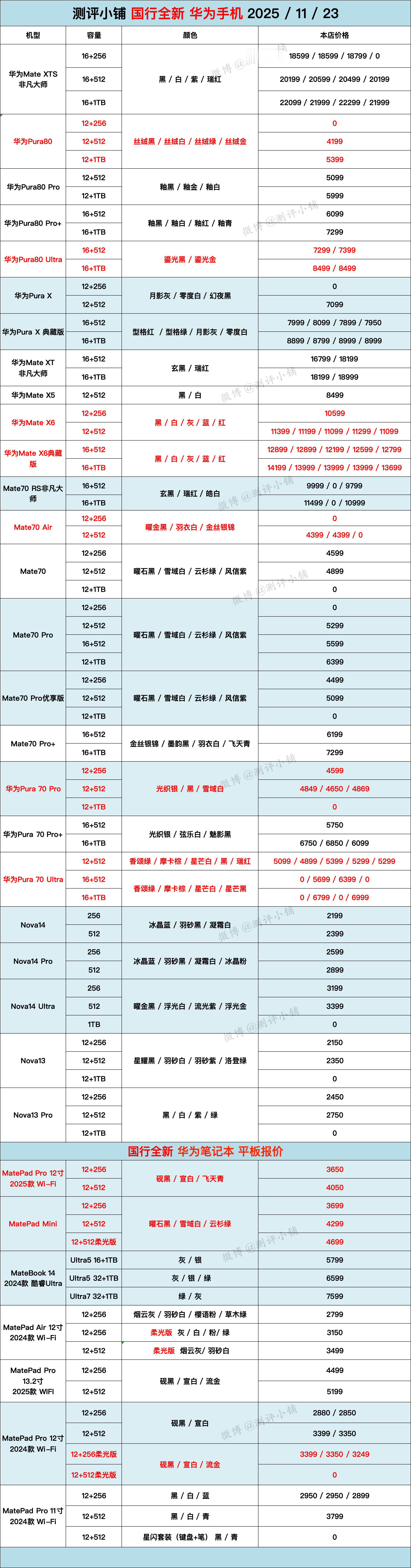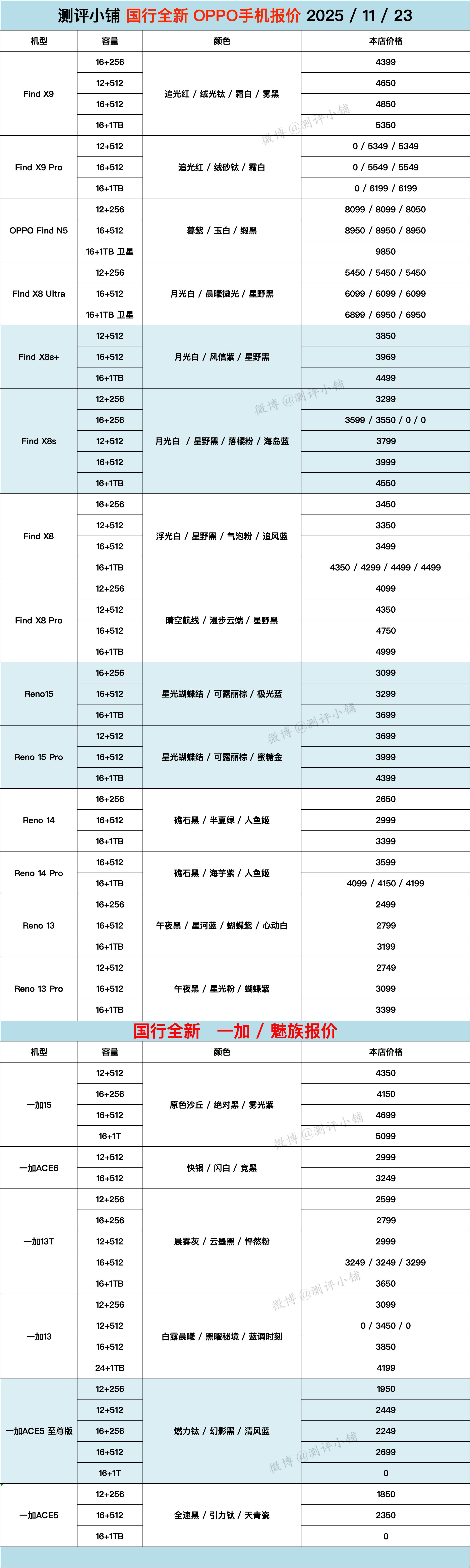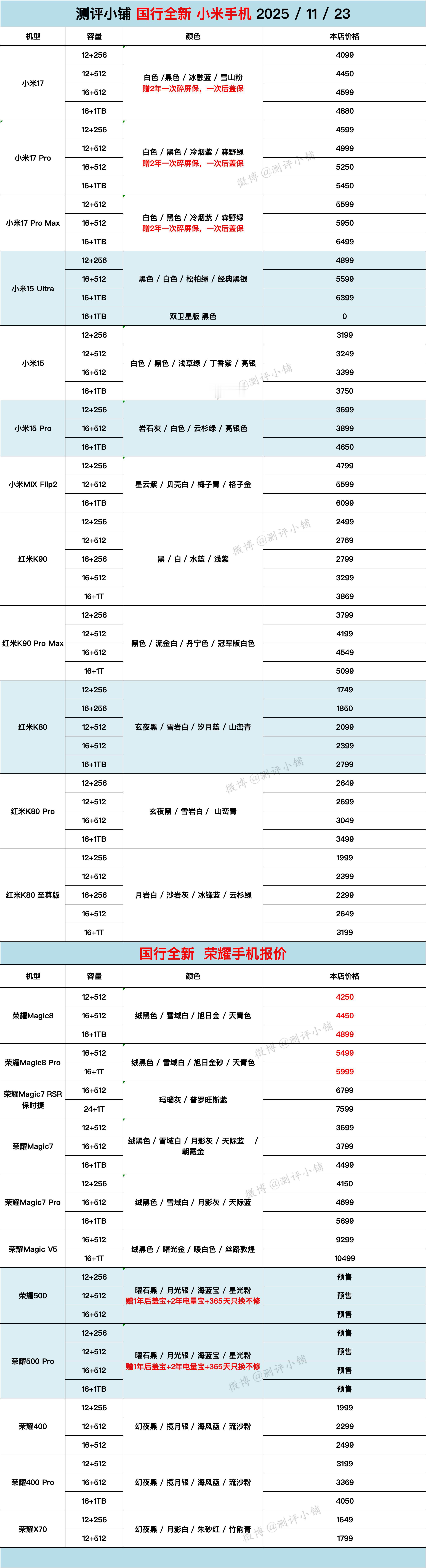 品牌排版有调整,国行全新。华为Mate XTS,荣耀Magic8系列,魅族22,一加系列,OPPO FindX8系列,vivo X300 Pro ,iQOO 15,手表配件等更新