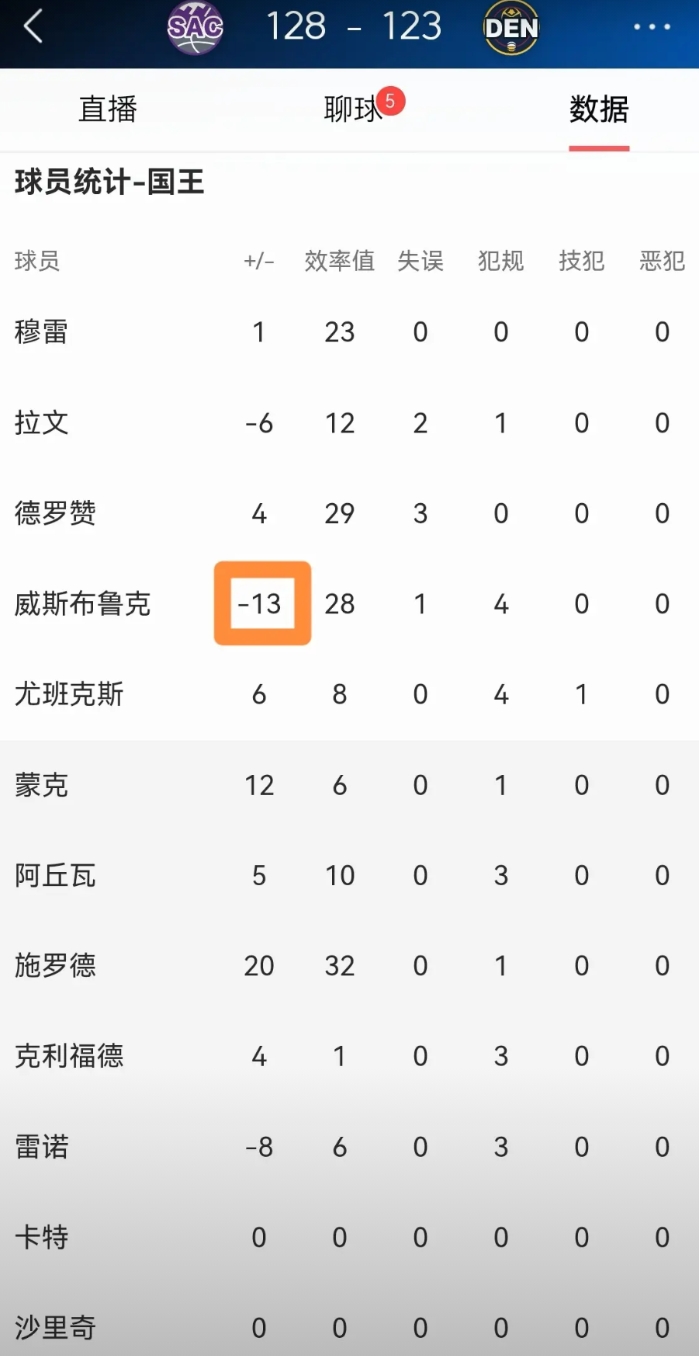 国王老将威斯布鲁克真是太奇怪了!在今天国王客场以128:123力克掘金的比赛中,威少打出了让人特别费解的表现。