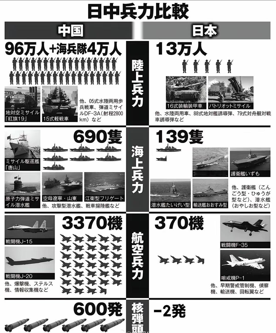 这是日本网友制作的中日兵力对比!现在的我兔不仅有钢铁的意志,还有快有意志的钢铁,小日子不会想硬碰硬吧
