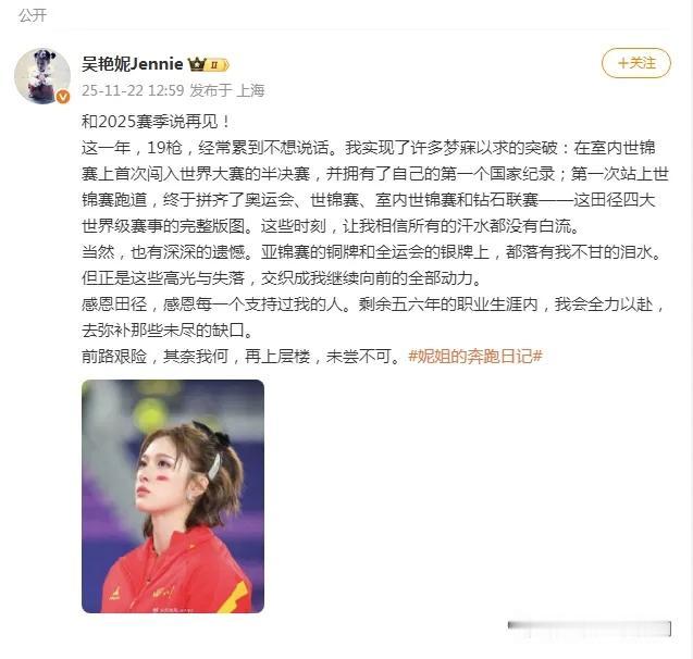吴艳妮:把遗憾熬成下一场的子弹。 当吴艳妮在朋友圈敲下“和2025赛季说再见”时