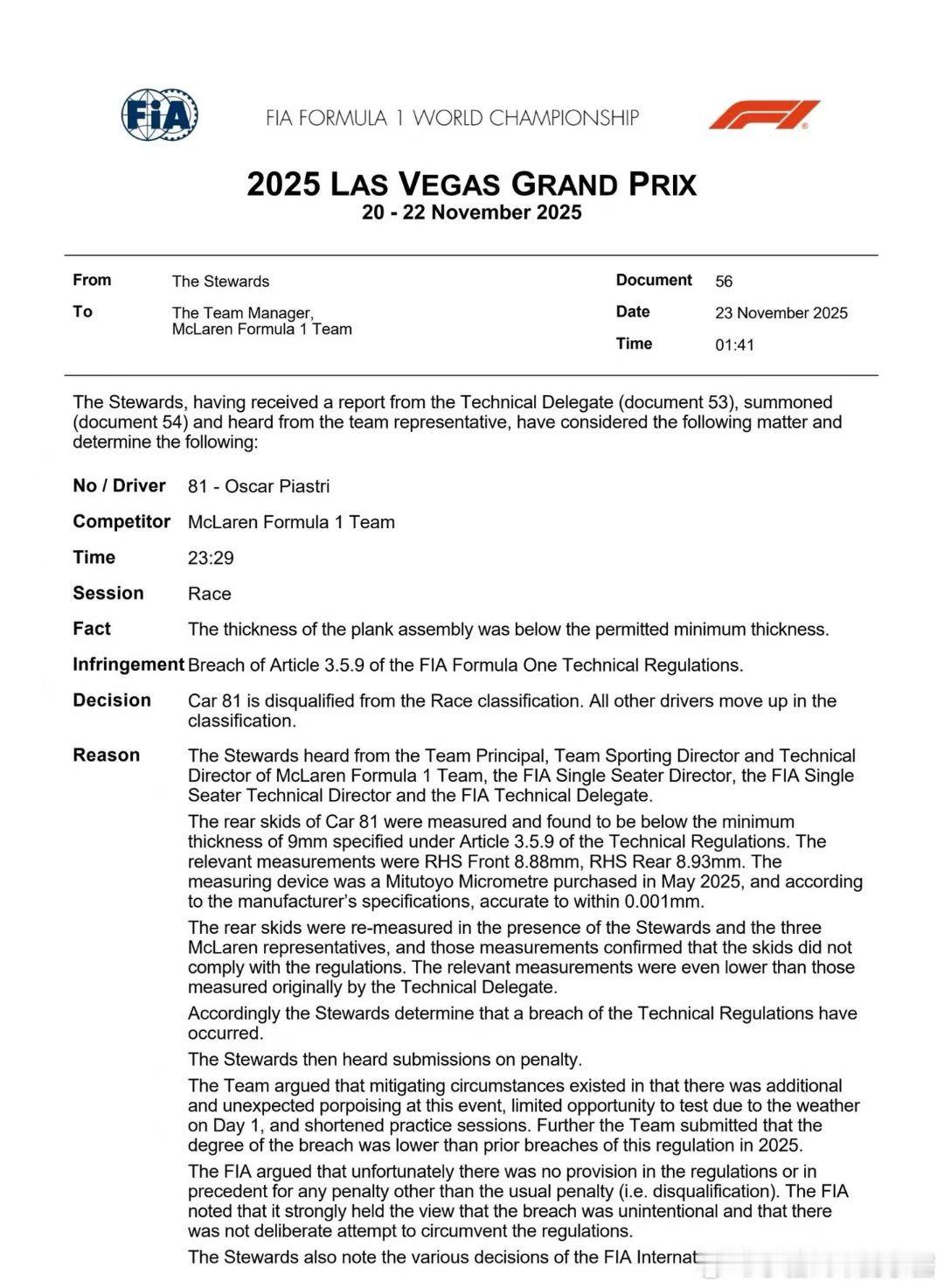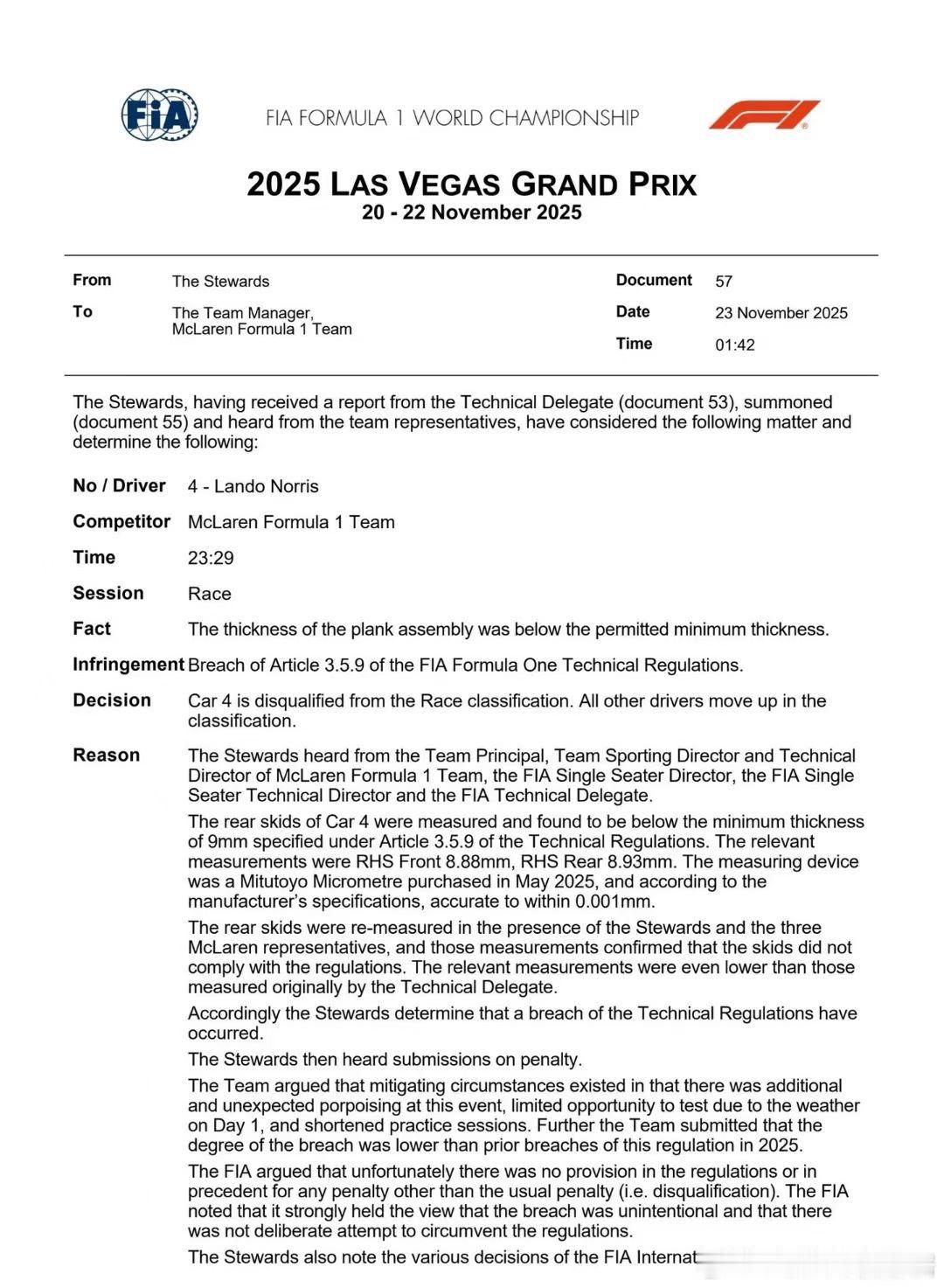 迈凯伦车队官方声明在拉斯维加斯大奖赛之后,我们被发现违反了技术规则第3.5.9条