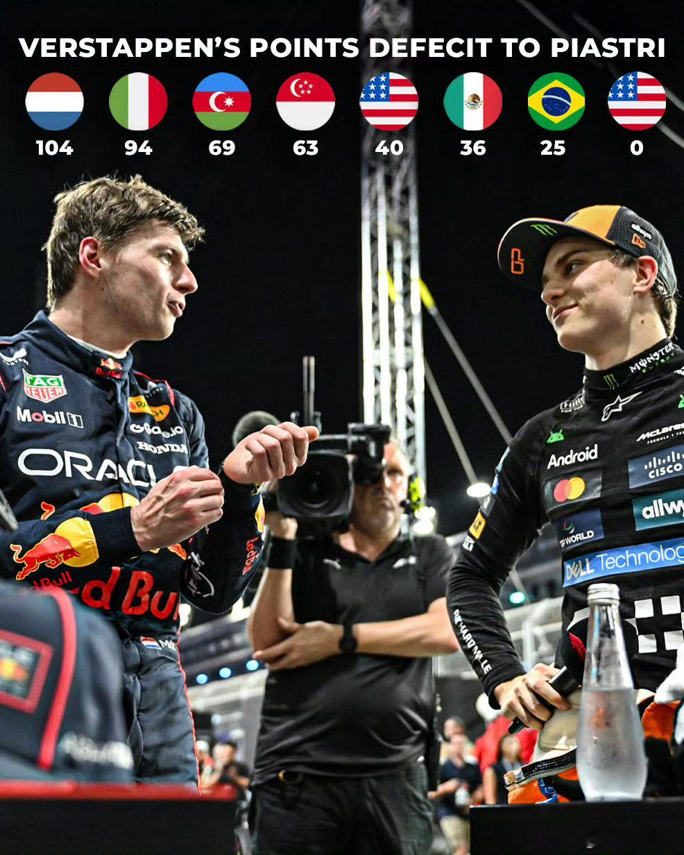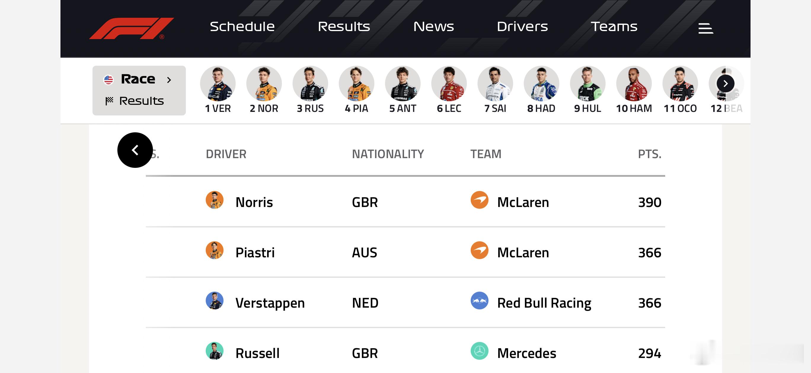 如果迈凯伦真被FIA把双车取消成绩,那车手年度积分就是诺里斯390,皮亚斯特里3