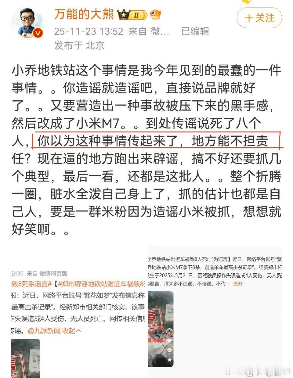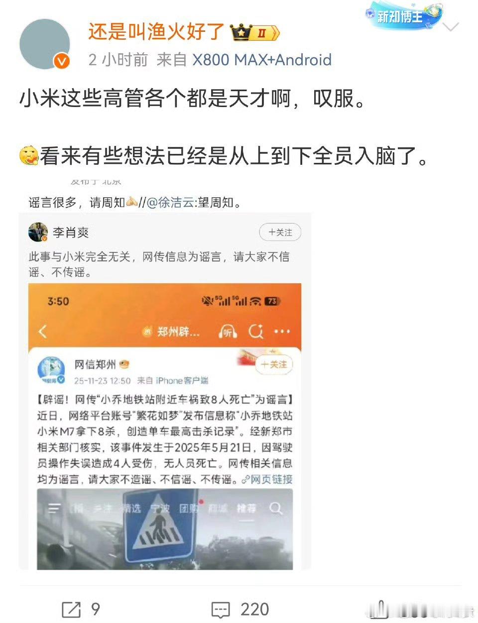 从这个事大家就可以看到某些媒体的嘴脸了,大家都在辟谣,只有这些人在拱火,满脑子只有对立…而且又在说什么一堆kml发这个内容,我寻思昨天我们都没人发啊,就是今天转发了郑州网信的辟谣,而且我也没看到什么米粉发,还是说只要发这些他们不喜欢的人就都是米粉?就是不诚实不正直的人?