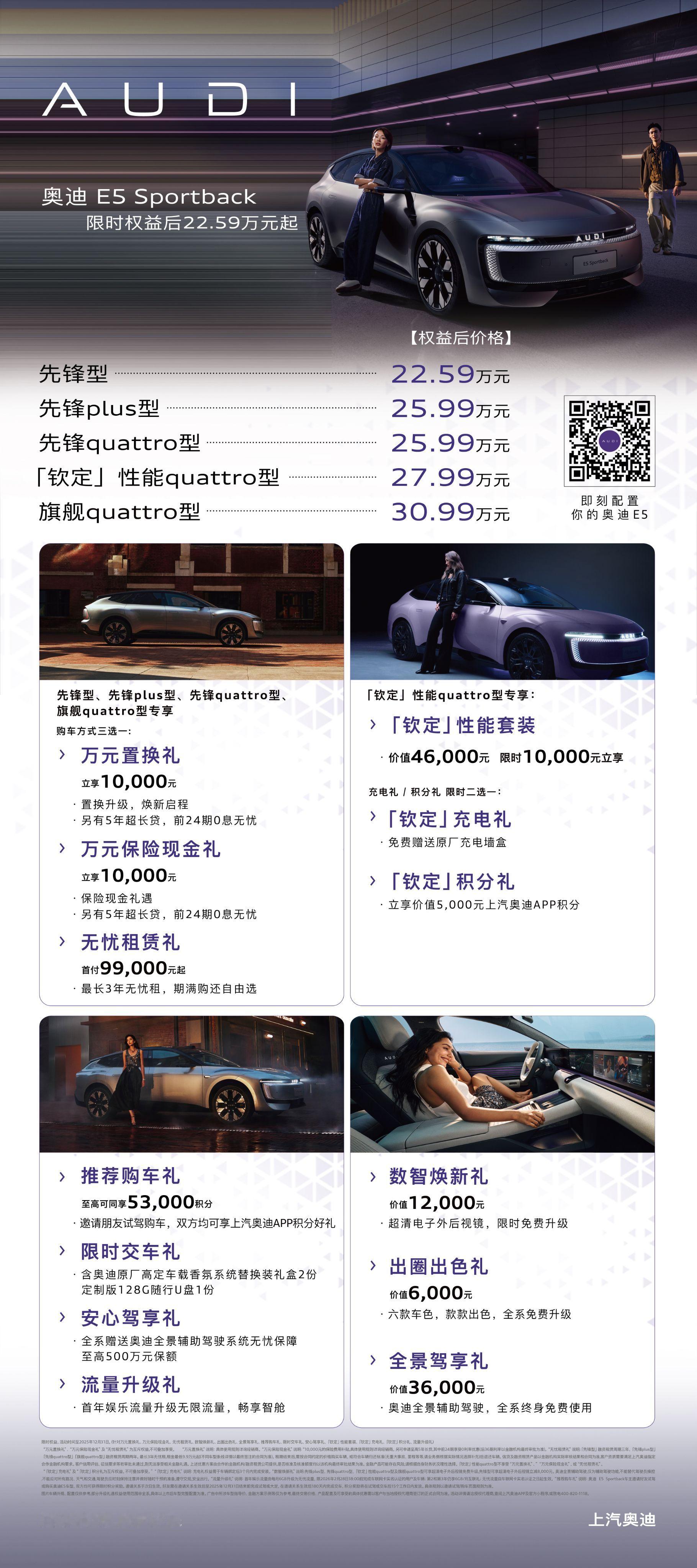 【】奥迪与网球冠军郑钦文的合作,带来了新的出行选择。作为此次联动的落地车型,奥迪纯电E5 Sportback在综合权益后,起售价为22.59万元。同时,奥迪推出了郑钦文「钦定」版车型。其包含的专属性能与外观套装价值4.6万元,目前可以1万元的限时价格升级,让车辆在驾驭体验上更具个性。展望未来,双方联动的视野不止于此。在广州车展完成首秀的奥迪纯电SUV概念车,以其全新的设计语言,预示了品牌在纯电SUV领域的探索。这款备受关注的车型,计划于2026年实现量产,标志着奥迪电动化进程的新阶段。